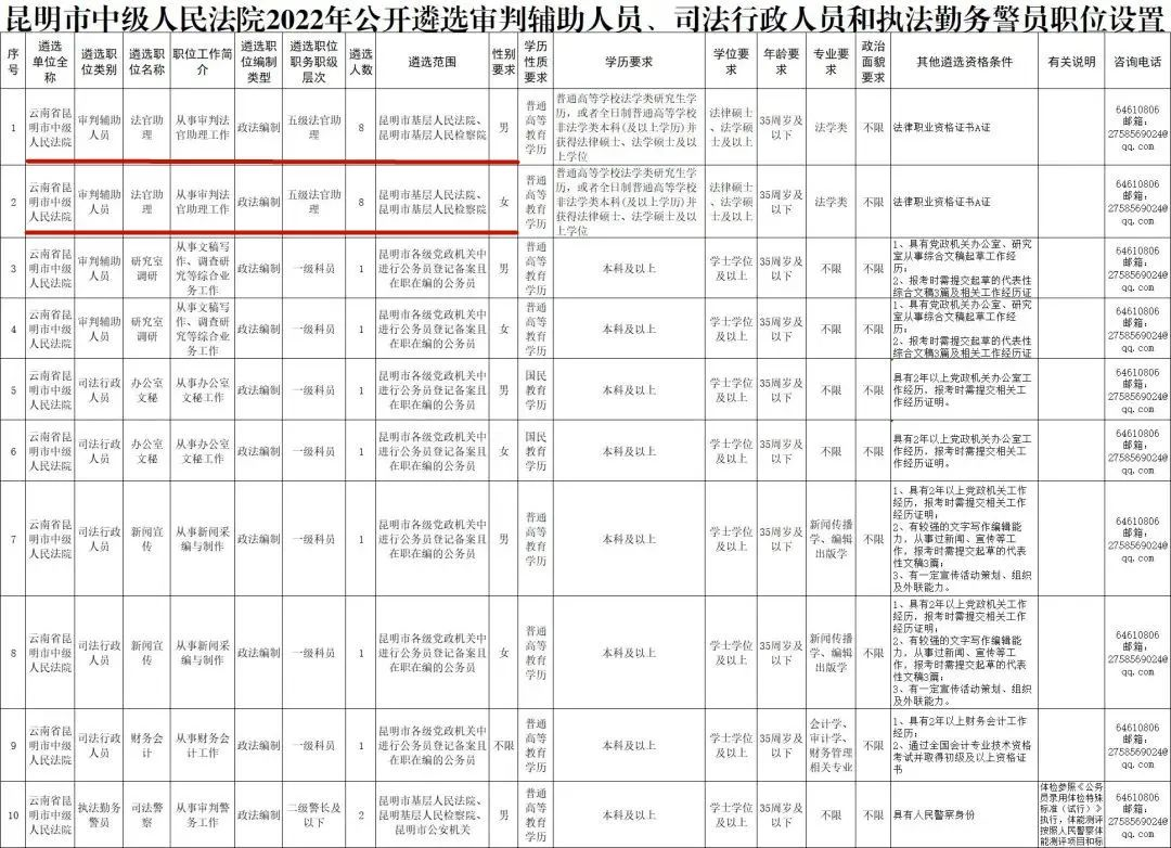首先,查询报考条件的《遴选公告》可知,昆明中院的这次遴选,并不是面向社会人员的遴选,而是限定了必须具备“昆明市各级党政机关、昆明市基层人民法院、昆明市基层人民检察院中已进行公务员登记备案且在编在岗、担任正科级及以下领导职务或一级主任科员及以下相当职级层次的公务员。”,以及“具有2年以上基层工作经历和2年以上公务员工作经历;报考人员应符合在本级机关(单位)工作的最低年限要求;没有规定的,须在本级机关工作2年以上(不含新录用试用期)。昆明市基层人民法院的公务员最低工作年限为:博士、硕士研究生3年以上,本科生、专科生5年以上。”的基本条件。
