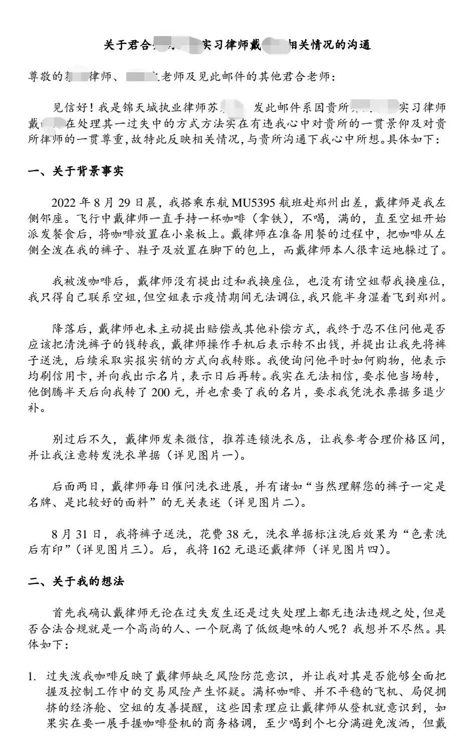 两大头部律所的两名律师,因为飞机上一杯打翻的咖啡引发的湿身事件,成为整个法律圈关注,甚至闹到了圈外。其实准确来说男律师并不是律师,而是“实习律师”。实习律师并不是律师,这个道理和“未婚妻”不是妻子一样一样的。为叙述方便,还是称该实习律师为律师吧。男律师来自君合,女律师来自锦天城。君合,头部律所之一,公司制红圈所,起薪2万+。锦天城,排名靠前的合伙制律所,上海第一大律所。其中,被咖啡湿身的女律师,怒发长信,颇有文采地揭露了男律师的猥琐言行,信件全文如下:尊敬的**律师、***老师及见此邮件的其他**老师:见信好!我是***执业律师苏**,发此邮件系因贵所并购*组实习律师戴**在处理其一过失中的方式方法实在有违我心中对贵所的一贯景仰及对贵所律师的一贯尊重,故特此反映相关情况,与贵所沟通下我心中所想。具体如下:2022 年 8 月 29 日晨,我搭乘东航 MU53** 航班赴郑州出差,戴**是我左侧邻座。飞行中戴律师一直手持一杯咖啡(拿铁),不喝,满的,直至空姐开始派发餐食后,将咖啡放置在小桌板上。戴律师在准备用餐的过程中,把咖啡从左侧全泼在我的裤子、鞋子及放置在脚下的包上,而戴律师本人很幸运地躲过了。我被泼咖啡后,戴律师没有提出过和我换座位,也没有请空姐帮我换座位,我只得自己联系空姐,但空姐表示疫情期间无法调位,我只能半身湿着飞到郑州。降落后,戴律师也未主动提出赔偿或其他补偿方式,我终于忍不住问他是否应该把清洗裤子的钱转我,戴律师操作手机后表示转不出钱,并提出让我先将裤子送洗,后续采取实报实销的方式向我转账。我便询问他平时如何购物,他表示均刷信用卡,并向我出示名片,表示日后再转。我实在无法相信,要求他当场转,他倒腾半天后向我转了 200 元,并也索要了我的名片,要求我凭洗衣票据多退少补。过后不久,戴律师发来微信,推荐连锁洗衣店,让我参考合理价格区间,并让我注意转发洗衣单据(详见图片一)。后面两日,戴律师每日催问洗衣进展,并有诸如“当然理解您的裤子一定是名牌、是比较好的面料”的无关表述(详见图片二)。8 月 31 日,我将裤子送洗,花费 38 元,洗衣单据标注洗后效果为“色素洗后有印”(详见图片三)后,我将 162 元退还戴律师(详见图片四)。