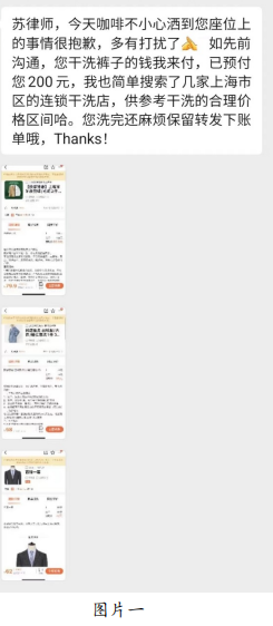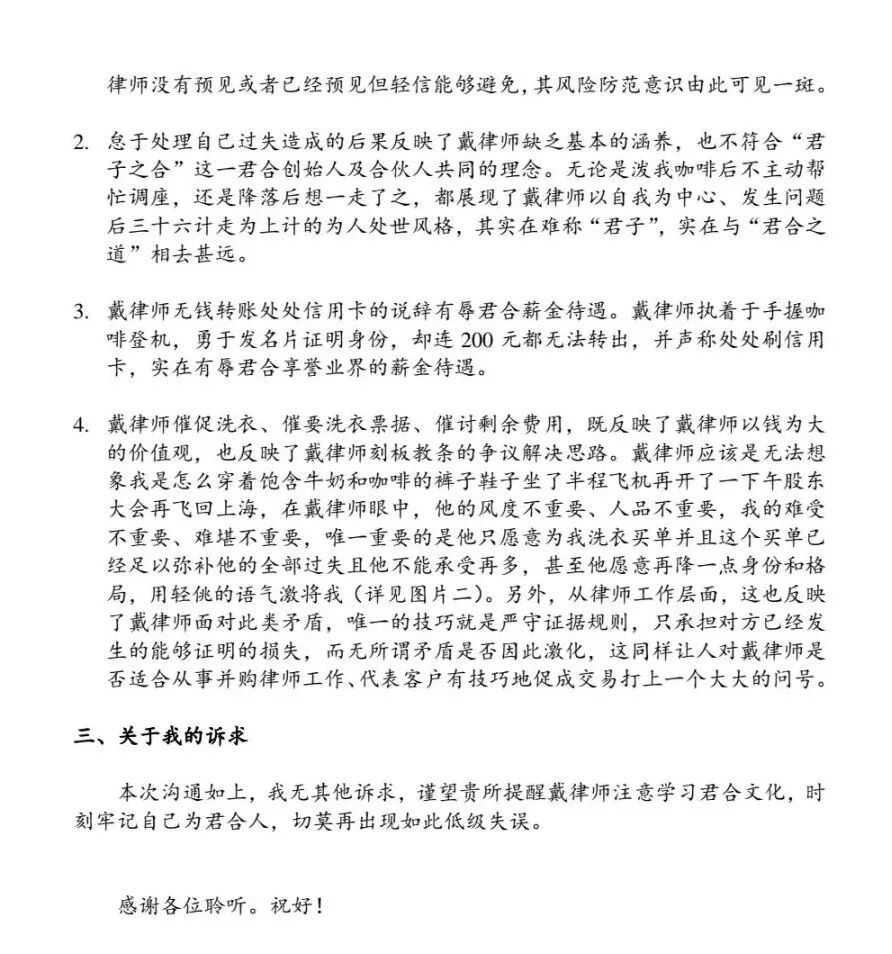 首先我确认戴律师无论在过失发生还是过失处理上都无违法违规之处,但是否合法合规就是一个高尚的人、一个脱离了低级趣味的人呢?我想并不尽然。具体如下:1. 过失泼我咖啡反映了戴律师缺乏风险防范意识,并让我对其是否能够全面把握及控制工作中的交易风险产生怀疑。满杯咖啡、并不平稳的飞机、局促拥挤的经济舱、空姐的友善提醒,这些因素理应让戴律师从登机就意识到,如果实在要一展手握咖啡登机的商务格调,至少喝到个七分满避免泼洒,但戴律师没有预见或者已经预见但轻信能够避免,其风险防范意识由此可见一斑。2. 怠于处理自己过失造成的后果反映了戴律师缺乏基本的涵养,也不符合“君子之合”这一君合创始人及合伙人共同的理念。无论是泼我咖啡后不主动帮忙调座,还是降落后想一走了之,都展现了戴律师以自我为中心、发生问题后三十六计走为上计的为人处世风格,其实在难称“君子”,实在与“君合之道”相去甚远。3.戴律师无钱转账处处信用卡的说辞有辱君合薪金待遇。戴律师执着于手握咖啡登机,勇于发名片证明身份,却连 200 元都无法转出,并声称处处刷信用卡,实在有辱君合享誉业界的薪金待遇。4. 戴律师催促洗衣、催要洗衣票据、催讨剩余费用,既反映了戴律师以钱为大的价值观,也反映了戴律师刻板教条的争议解决思路。戴律师应该是无法想象我是怎么穿着饱含牛奶和咖啡的裤子鞋子坐了半程飞机再开了一下午股东大会再飞回上海,在戴律师眼中,他的风度不重要、人品不重要,我的难受不重要、难堪不重要,唯一重要的是他只愿意为我洗衣买单,并且这个买单已经足以弥补他的全部过失,且他不能承受再多,甚至他愿意再降一点身份和格局,用轻佻的语气激将我(详见图片二)。另外,从律师工作层面,这也反映了戴律师面对此类矛盾,唯一的技巧就是严守证据规则,只承担对方已经发生的能够证明的损失,而无所谓矛盾是否因此激化,这同样让人对戴律师是否适合从事并购律师工作、代表客户有技巧地促成交易打上一个大大的问号。本次沟通如上,我无其他诉求,谨望贵所提醒戴律师注意学习君合文化,时刻牢记自己为君合人,切莫再出现如此低级失误。烟语君语:真是身在名所却无人知,一杯咖啡声名远播,究竟是好名声,还是坏名声呢?