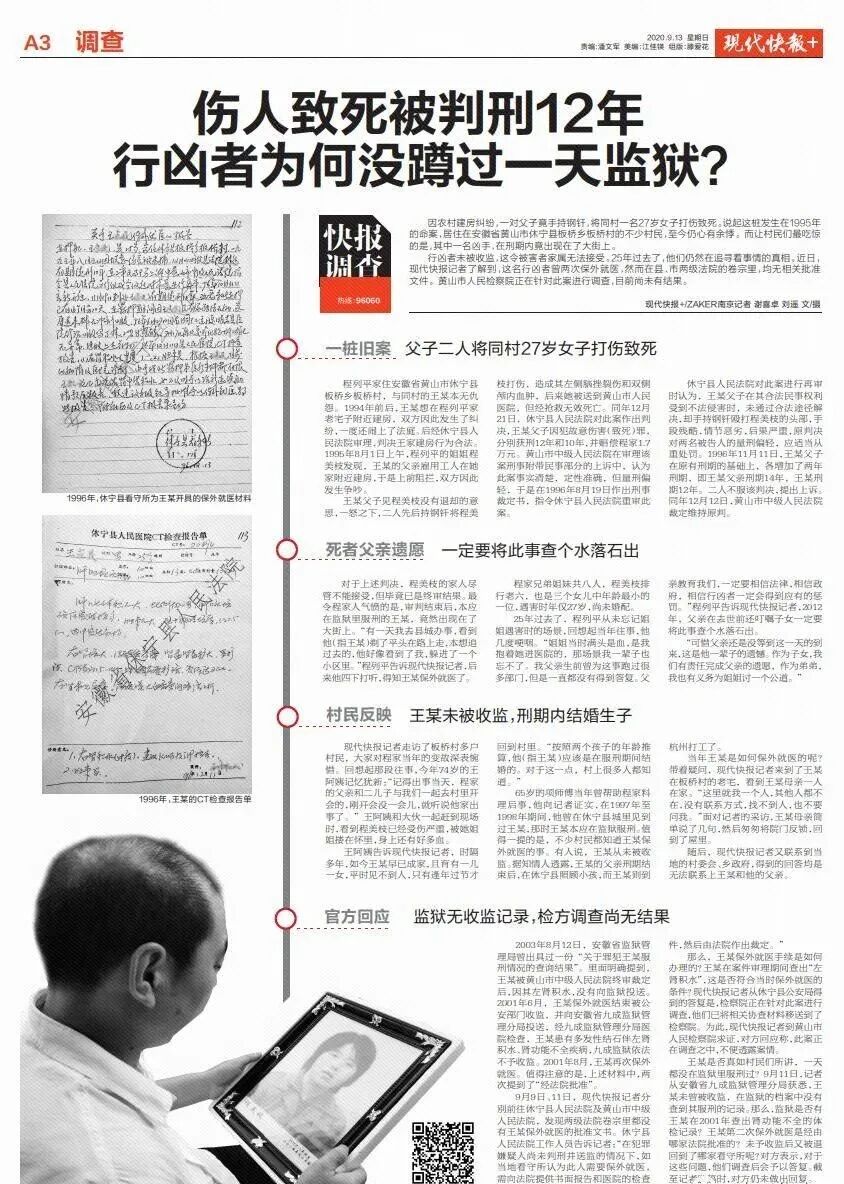 “我们根据调查结果,一共处理了23人。”休宁县纪委监委的相关人员补充道,“这些人多数已经退休,他们中有当时县一级的看守所、派出所负责人,还有时任公安机关、检察机关、法院的分管领导等等。这些人在王某刑罚执行期间,存在审批程序、监管等工作不到位、不规范等问题,相关人员均已被处理。其中,问题最严重的1人被‘双撤’。”对于程列平提及的《答复》中未盖公章问题,该负责人称,联合调查组是临时机构,没有公章,也不能盖市县两级政法委的章。与此同时,对方也表示,王某不会被重新收监。“被处理的公职人员在审批程序、监管等工作虽有瑕疵,但这对于案件本身无碍,对当时王某是否需要收监等问题,也不受影响。”【疑问】去年就有了调查结果为何才公布?只回复当事人算“向社会公布”吗?2020年9月13日,休宁县政法委在官方微博、微信号均发文表示,“调查结果会及时向社会公布”。可实际上,该案在2021年就已有了结果,至今却为何迟迟不见公开?对此,前述休宁县政法委相关负责人接受现代快报记者采访时解释:“这是一个公开的范围和形式的问题,实际上县里很多人都知道此案的调查结果,只不过没有向媒体公布。”那么,“联合调查组”给当事人的《回复》算是“向社会公布”吗?“县里很多人知道”就算公开了吗?江苏钟山明镜律师事务所律师张骏表示,政府信息公开有两种方式:依职权主动公开和依申请公开。前者是指,行政机关应当将主动公开的政府信息,通过政府公报、网站、新闻发布会以及报刊、广播、电视等便于公众知晓的方式公开;后者则是,当事人申请公开某些信息,行政机关应为其依法申请获取政府信息提供便利。“当地政法委在宣布成立调查组时,就采取了依职权主动公开的方式,那么在有调查结果之后,也可以一样在社交平台官方账号、政府网站上发布。”张骏认为,此案有一定的社会影响,若能将处理结果在公共信息渠道公开,有利于当地政府树立公信力。来源:现代快报