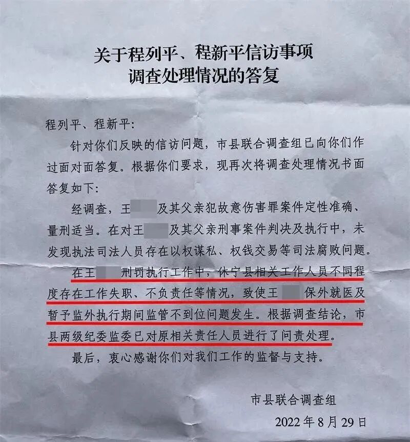 案件调查期间,程列平与哥哥程新平经常去询问进展,可均未得到书面答复。直到2022年8月29日上午,程新平突然接到休宁县政法委通知,让他去当地信访局会面,说是要给书面调查结果。最后,他拿到了一份文件——《关于程列平、程新平信访事项调查处理情况的答复》(以下简称《答复》)。《答复》中明确提到:“在王某刑罚执行工作中,休宁县相关工作人员不同程度存在工作失职、不负责任等情况,致使王某保外就医及暂予监外执行期间监管不到位问题发生。根据调查结论,市县两级纪委监委已对原相关责任人员进行了问责处理。”这份《答复》既非红头文件,落款处也没有加盖单位公章,仅仅在文末署名“市县联合调查组”。“我们等了两年,没想到等来的却是一个‘三无产品’。首先,它没有公章。第二,不知道哪些人在这个案子中存在问题?第三,纪委监委是怎么处理这些问题人员的。”程列平说:“这份所谓的《答复》,其实就是他们拿来糊弄我家的一张废纸。”【回应】调查早已结束:23人被处理,有人被“双撤”2022年9月1日,休宁县政法委相关负责人告诉现代快报记者,此案刚开始的确由县政法委成立调查组,但由于案情重大,且“自己调查自己不具说服力”,很快就改由黄山市政法委牵头,协调各部门成立联合调查组,专门负责彻查此案。2021年下半年,就有了调查结果。![]()