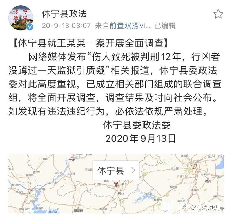 2020年9月12日,现代快报报道了这起案件。次日凌晨3点,休宁县政法委宣布成立联合调查组,声称要全面开展调查,结果会及时向社会公布。![]()