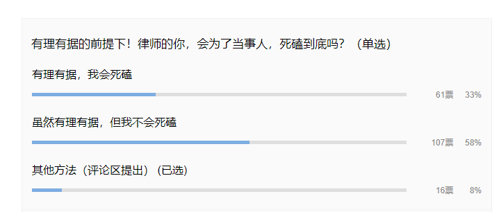 律师认为,只要做到第二种,有回执证明已经为当事人及时维护了诉讼时效,就可以算是维护了当事人的权益了,没必要死磕到底,将事情复杂化。文末,作者还将三种方式进行了公开投票,得票结果是,律师的观点获得了大部分的支持。![]()