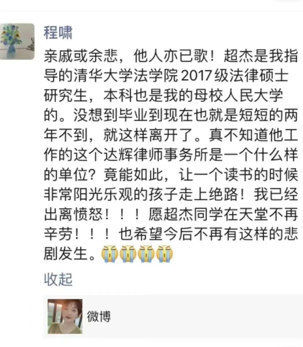昨天,尽管没有涉事方的回应,但以下这则被自媒体爆料、众多网友不断验证拼凑起来的年轻律师跳楼自杀的新闻,还是震惊了法律圈。消息传来,该律师的研究生导师悲痛之余惊问,到底是什么原因,让自己的读书时阳光乐观的学生,短短两年之内,走上了自杀的结局?