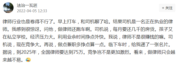 今年4月份,有律师在朋友圈发文称,自己打算注销了律师证,换一座生活成本不高的小城市,另谋职业。同期有网友感慨,早上出门打车,司机居然是一名执业律师,经济压力下,不得不利用业务时间挣点外快。