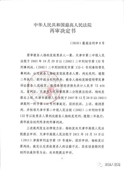 19年前,杨松发因一起命案被抓。2001年3月3日晚,与杨松发同一公司的一名女工惨遭杀害,时年36岁的杨松发涉嫌故意杀人。2003年10月29日,天津市第二中级人民法院一审认为,杨松发犯故意杀人罪,判处死刑,缓期二年执行,剥夺政治权利终身。