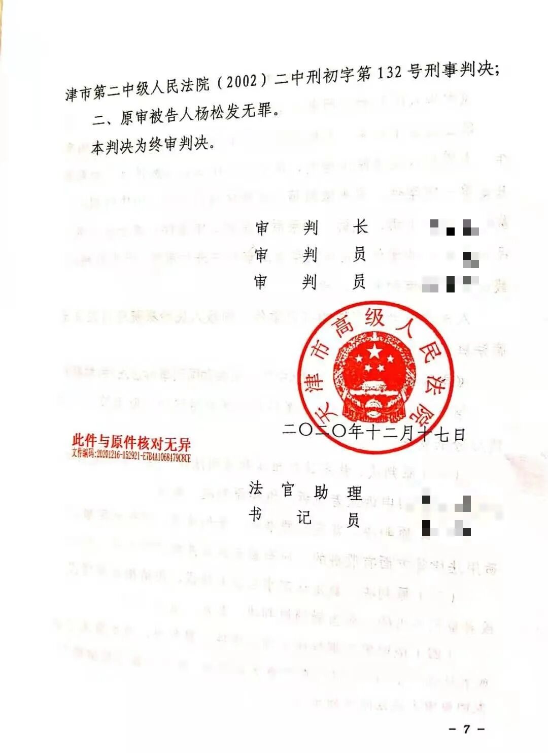上述裁判发生法律效力后,杨松发向天津市高级人民法院提出申诉,天津市高级人民法院于2011年10月14日以(2011)津高审刑监字第19号通知,驳回申诉。杨松发以原判决、裁定认定其故意杀人的证据不足,其在侦查期间受到刑讯逼供等为由,向本院提出申诉。