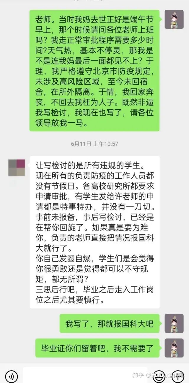 博士认为,虽然没请假,但事发法定假日,且遵守了上级的防疫规定,回京后主动在外隔离,自己没有犯错,如今被层层施压要请求写检讨,实在是在自己母亲去世之后,遭受到了二次伤害。据称,有同事安慰其,他们组一个师姐父亲去世请假回家,领导说,人都死了,回去干嘛?博士认为,这样的做法,令其极度寒心,母亲去世,如不能回去奔丧,枉为人子,实在令人无法容忍。