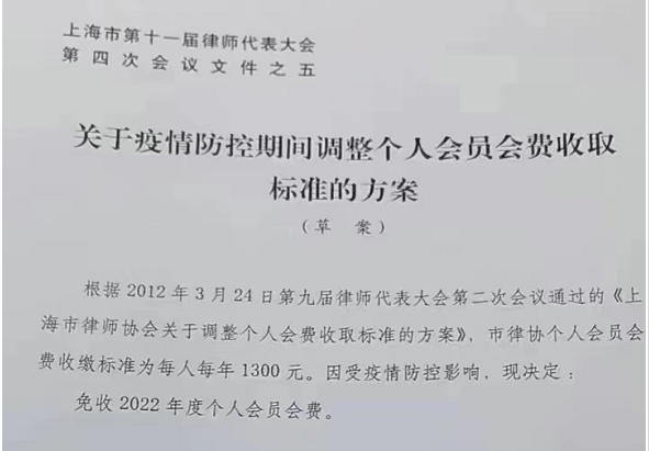 今天(10月29日)上午,上海市第十一届律师代表大会第四次会议审议通过《关于疫情防控期间调整个人会员会费收取标准的方案》。根据2012年3月24日第九届律师代表大会第二次会议通过的《上海市律师协会关于调整个人会费收取标准的方案》,市律协个人会员会费收缴标准为每人每年1300元。因受疫情防控影响,现决定:免收2022年度个人会员会费。![]()