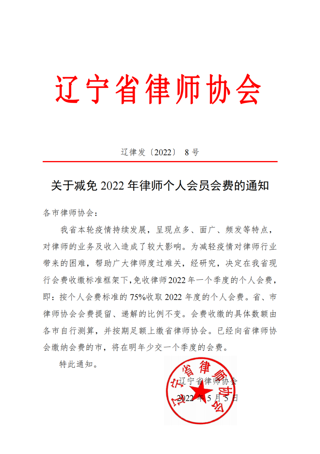 辽宁省律师协会关于减免 2022 年律师个人会员会费的通知(20220505)