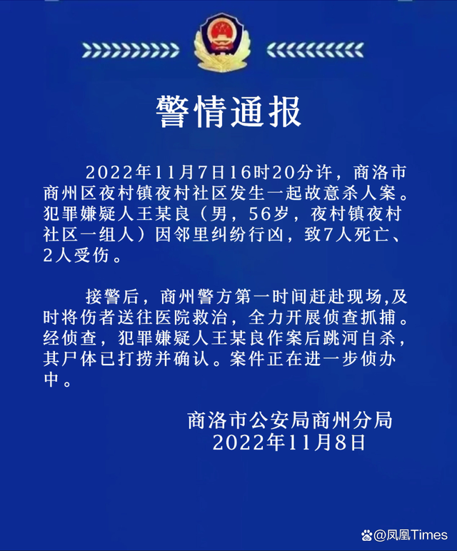 “商州公安”微信公众号消息,陕西商洛市公安局商州分局通报:2022年11月7日16时20分许,商洛市商州区夜村镇夜村社区发生一起故意杀人案。犯罪嫌疑人王某良(男,56岁,夜村镇夜村社区一组人)因邻里纠纷行凶,致7人死亡、2人受伤。