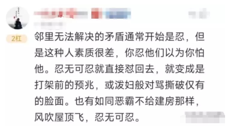 正常的情况下, 发生邻里纠纷,旁观者劝一劝,基层组织公正的调解一下,远亲不如近邻,矛盾可能就化解了。底层人群之间,有一个底线一定不能突破,那就是不要长期欺负老实人。否则的话,一旦爆发,后果相当严重。