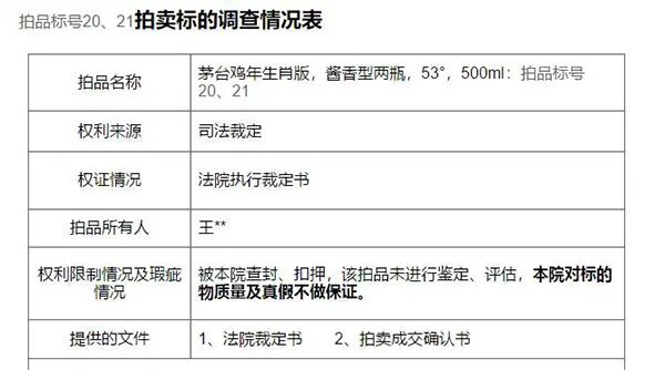 搜索可知,法院拍卖名酒“不保真”,并不是首例,也不是个例。今年6月,江西省九江市某区法院处置涉刑财产时拍卖了一批“安徽缘酒”,也特别提醒,标的物以实物现状为准,法院不承担标的物的瑕疵保证责任。2021年2021年10月,“齐鲁晚报”报道,山东泰安一人民法院在网路平台司法拍卖贵州茅台酒12瓶,评估价为54000元,起拍价为54000元,“标的物的真伪、名称、规格型号、实际数量、购置日期、新旧程度及能否使用以实际交付时的现状为准。本院不对标的物的使用性能、真伪等负责。”![]()