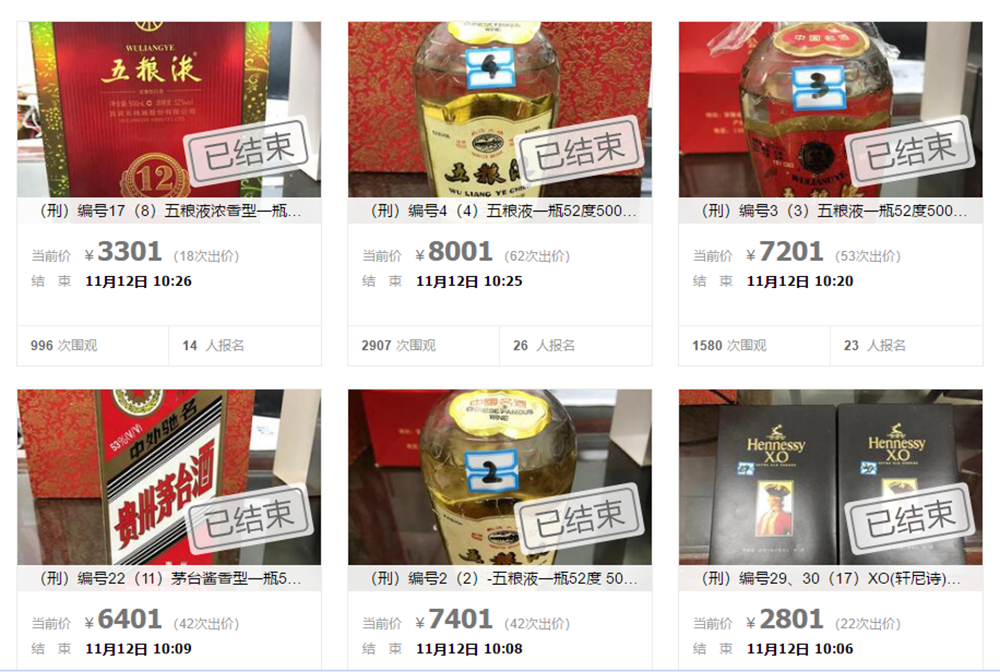 近日赶着双十一购物季,多家媒体报道,11月11日-12日,安徽马鞍山市博望区法院通过司法拍卖平台公开拍卖了一批酒品,起拍价均为1元,其中包括“五粮液”“茅台”“轩尼诗”“马爹利”等。其中,一瓶生产日期为1987年的52度“五粮液”经过62轮出价,最终以8001元成交。