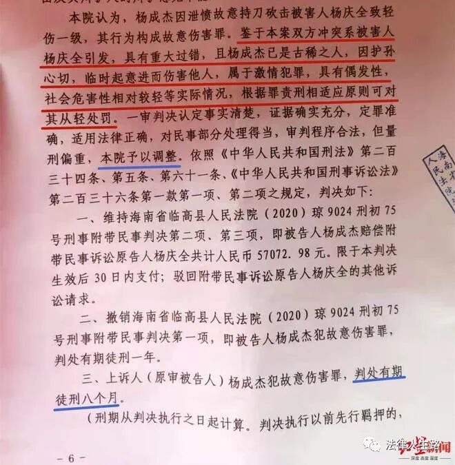 案发近3年后的2020年5月,临高县检察院以故意伤害罪向法院提起公诉。临高县法院在一审判决书中称,杨成杰看到孙子被掐脖子时,没有采取相当手段来阻止侵害行为,而是直接持刀砍击,不属正当防卫,判处杨成杰有期徒刑一年。