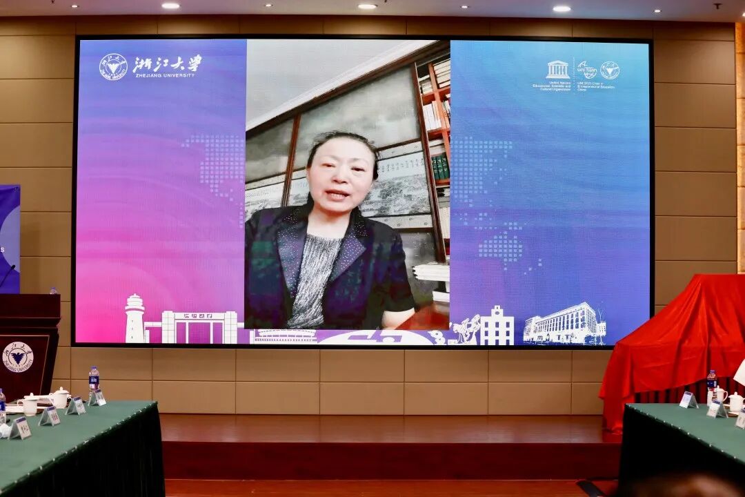 高等教育出版社副总编辑龙杰通过视频的方式发来致辞。她代表高教社对丛书的发行表示热烈的祝贺,她指出该丛书是高教社与浙江大学教育学院至诚合作的结晶,丛书的出版为国内外教育领域认知中国教育提供了很好的参考,对构建中国教育对外传播内容体系作出了重要贡献。