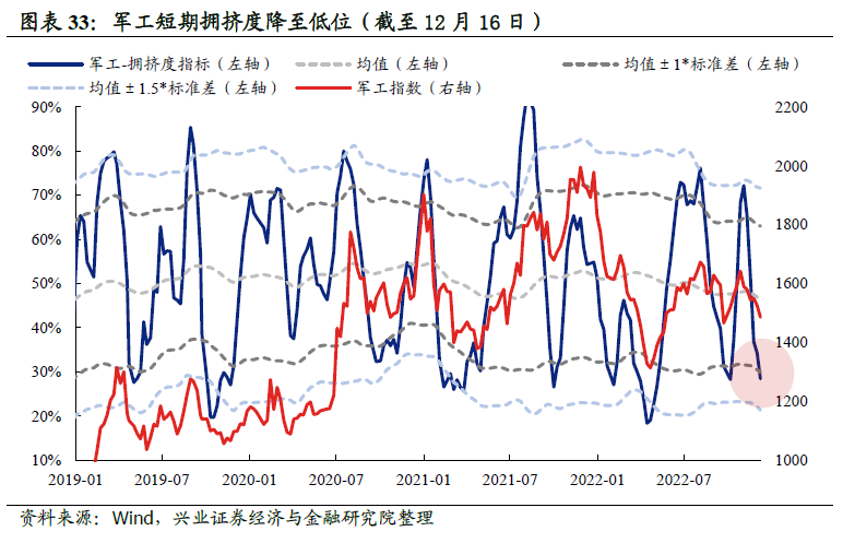 中期拥挤度中等偏低,短期拥挤度则已降至低位。经历近期的持续调整,军工行业短期拥挤度指标已再度降至较低水位,而从中期维度看,军工拥挤度压力也不大,处于中等偏低位置。![]()