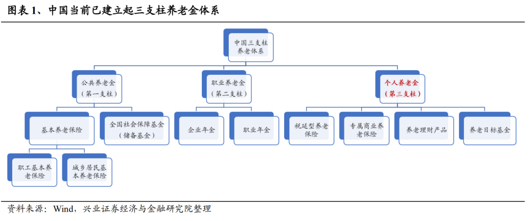 世界银行在1994年提出养老金三支柱体系,个人养老金属于养老金第三支柱。1994年,世界银行发布报告《防止老龄危机——保护老年人及促进增长的政策》,明确提出养老金三支柱体系:第一支柱为强制性税收融资的公共支柱,即公共养老金,采用现收现付制;第二支柱为企业和个人共同缴交的职业养老金;第三支柱是政府给予税收优惠、以个人名义自愿参与的养老金,即个人养老金,包括保险、基金、信托、理财等多种形式。
