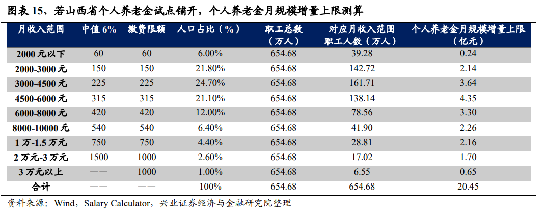 根据上述假设与思路,下文以山西省为例,对个人养老金的规模增量做测算,步骤如下: