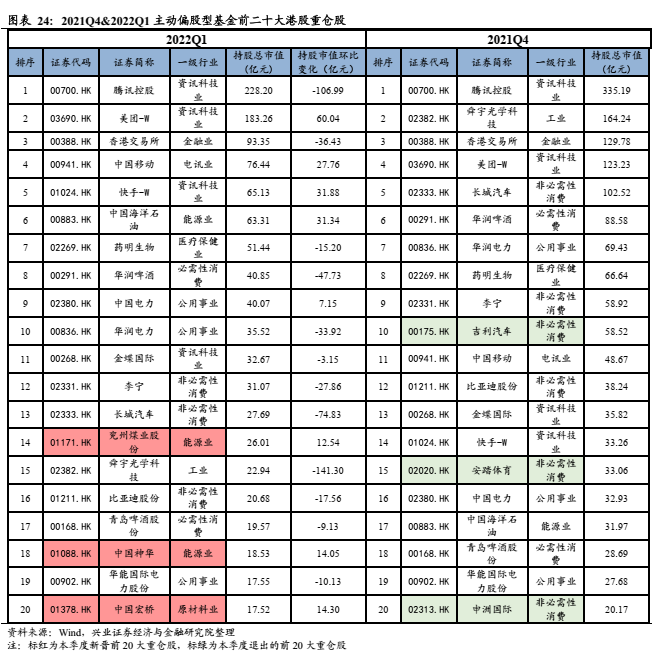 重仓股层面,腾讯控股依然是港股第一大重仓股,但其持股市值环比下降超3成。截止2022年一季度,港股前5大重仓股为腾讯控股、美团-W、香港交易所、中国移动和快手-W,持股市值分别为228.2亿、183.26亿、93.35亿、76.44亿和65.13亿。与2022Q4相比,港股前20大重仓中,新增兖州煤业股份、中国神华和中国宏桥。