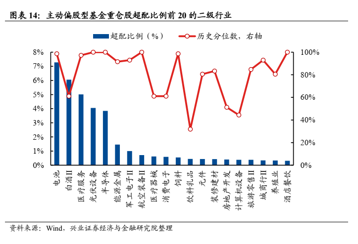 1)电力设备行业整体被继续加仓,但结构上出现分化。加仓的细分行业是光伏设备、电池等,但同时减仓风电设备、电网设备。