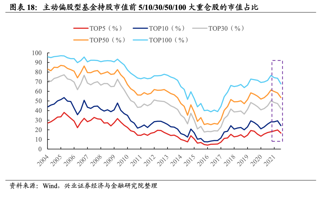 公募基金在A股的占比小幅下滑。截止2022Q1,全市场所有基金持有A股的市值为5.46万亿元,较上一季度减少15.22%。公募基金占A股总市值的比例自2017Q4以来首次出现回落,由2021Q4的7.03%下滑0.25%至6.78%。公募基金仍然是A股目前最大的机构投资者。![]()