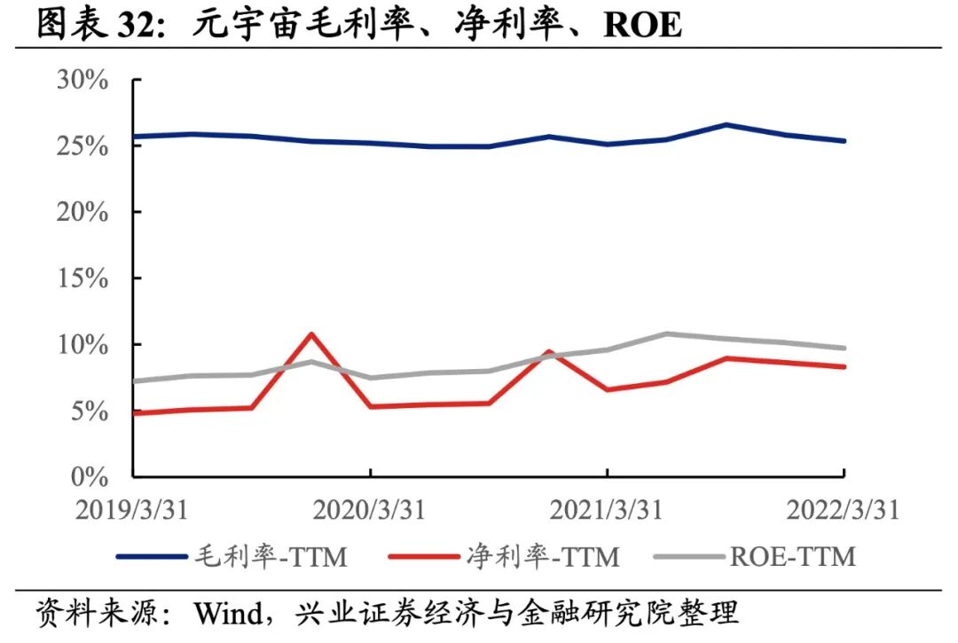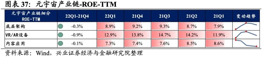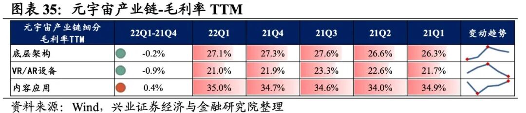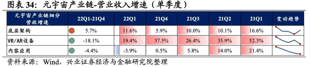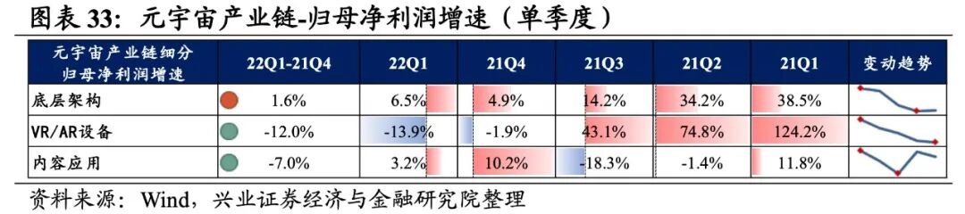 元宇宙产业链涵盖底层架构、VR/AR设备、内容应用,共计3个细分行业。元宇宙产业链归母净利润增速持续回落,盈利能力有所回落。从元宇宙产业链整体来看,22Q1单季度归母净利润增速、营收增速分别是-0.71%、13.09%,较21Q4单季度增速分别回落3.1pct、2.5pct,归母净利润增速持续回落至负区间。盈利能力有所回落,毛利率、净利率、ROE下滑0.5pct、0.3pct、0.4pct。元宇宙产业链环节景气出现分化,设备环节承压,底层架构归母净利润增速较高,其次是内容应用环节,VR/AR设备录得大幅负增长。从增速趋势来看,除底层架构外,其余环节归母净利润增速均下滑,VR/AR设备增速下滑的幅度最大。盈利能力方面,仅内容应用毛利率或净利率有所提升,VR/AR设备盈利能力下滑幅度最大。具体来看:1)底层架构:业绩增速整体回升,盈利能力连续回落。22Q1归母净利润增速、营收增速分别是6.5%、11.6%,增速较21Q4提升了1.6pct、5.7pct,业绩增速整体回升。但盈利能力有所回落,毛利率、净利率回落了0.2pct、0.1pct,均出现连续两个季度回落的情况。2)VR/AR设备:归母净利润加速下滑,盈利能力有所回落。22Q1归母净利润增速、营收增速分别是-13.9%、19.4%,增速较21Q4回落了12.0pct、18.1pct,归母净利润加速下滑。盈利能力有所回落,毛利率、净利率回落了0.9pct、0.7pct。3)内容应用:归母净利润增速转负,不过盈利能力维持增长。22Q1归母净利润增速、营收增速分别是3.2%、-3.9%,增速较21Q4回落了7.0pct、4.4pct,归母净利润增速转负。不过盈利能力维持增长,毛利率、净利率回升了0.4pct、0.1pct,毛利率连续四个季度提升。![]()