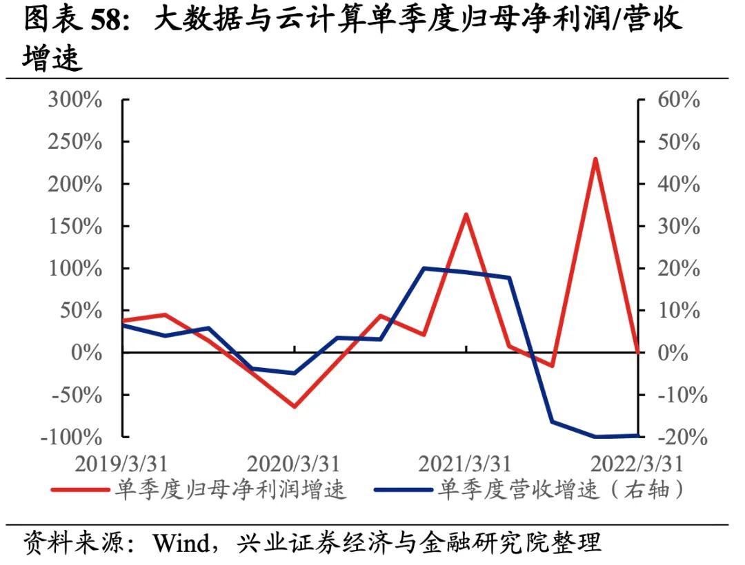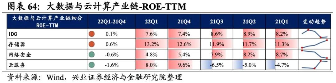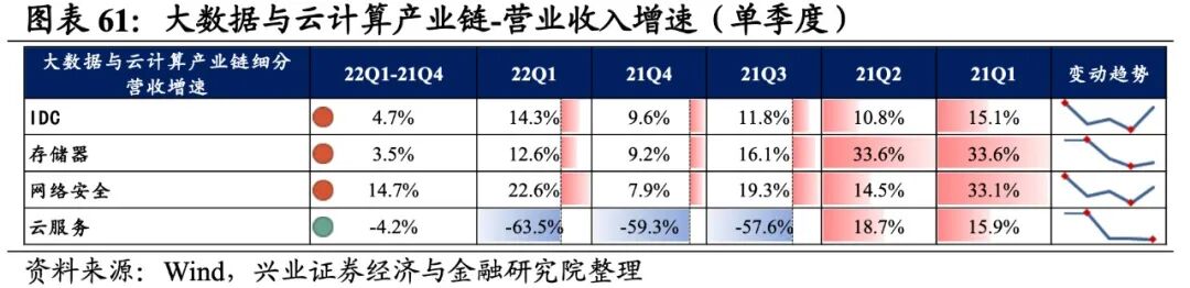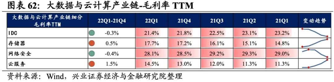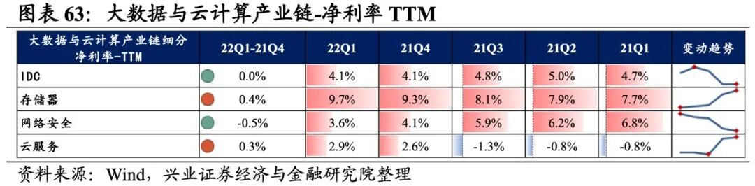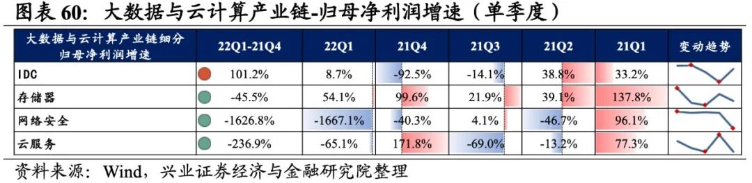 大数据与云计算产业链环节景气出现分化,网络安全承压,存储器归母净利润增速较高,其次是IDC,网络安全则录得大幅负增长。从增速趋势来看,除IDC外,其余细分产业链归母净利润增速均下滑,网络安全增速下滑的幅度最大。盈利能力方面,存储器、云服务盈利能力均较21Q4环比提升,IDC、网络安全毛利率或净利率有所下滑。具体来看:1)IDC:归母净利润增速大幅提升,毛利率持续回落。22Q1归母净利润增速、营收增速分别是8.7%、14.3%,增速较21Q4提升了101.2pct、4.7pct,归母净利润增速大幅提升且由负转正。盈利能力持续回落,毛利率下行0.3pct,连续四个季度回落,净利率持平于21Q4。2)存储器:归母净利润增速回落但依然处于较高水平,盈利能力持续提升。22Q1归母净利润增速、营收增速分别是54.1%、12.6%,增速较21Q4回落了45.5pct、提升了3.5pct,归母净利润增速回落但依然处于较高水平。盈利能力持续提升,毛利率、净利率提升了0.5pct、0.4pct,均出现连续四个季度提升的情况。3)网络安全:归母净利润加速回落,不过营收边际改善,盈利能力持续回落。22Q1归母净利润增速、营收增速分别是-1667.1%、22.6%,增速较21Q4回落了1626.8pct、提升了14.7pct,归母净利润回落,不过营收边际改善。盈利能力持续回落,毛利率、净利率回落了0.4pct、0.5pct,均出现连续四个季度回落的情况。4)云服务:业绩整体处于大幅负增长,盈利能力持续改善。22Q1归母净利润增速、营收增速分别是-65.1%、-63.5%,增速较21Q4回落了236.9pct、4.2pct,业绩整体处于大幅负增长。盈利能力持续改善,毛利率、净利率提升了1.5pct、0.3pct,均出现连续四个季度提升的情况。