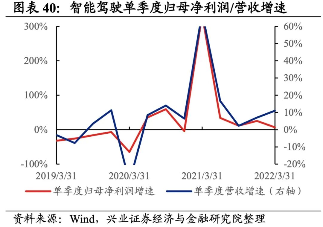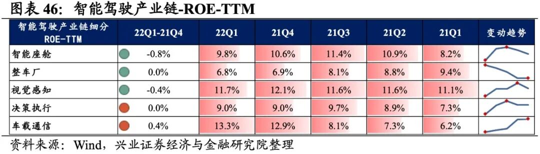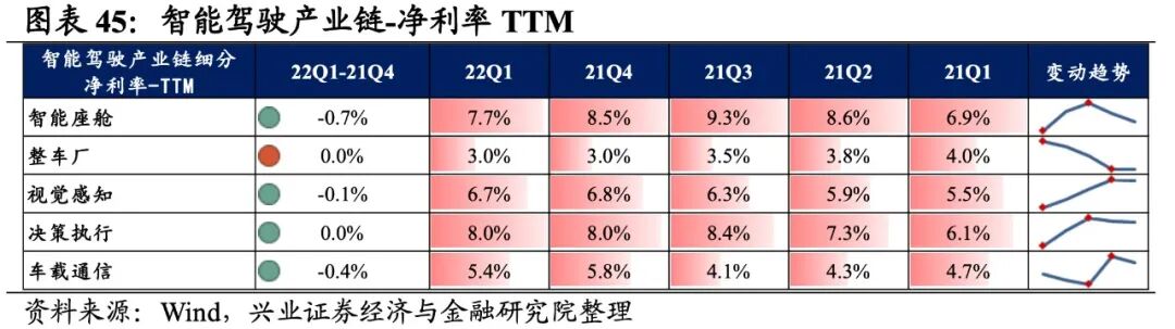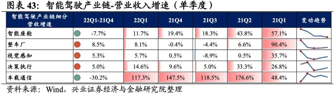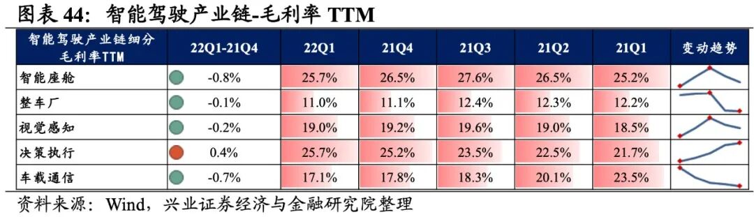 智能驾驶产业链景气度整体有所提升,整车厂归母净利润增速最高,其次是车载通信、决策执行,智能座舱出现负增速。从增速趋势来看,除视觉感知和车载通信环节增速有所回落外,其他环节增速均较21Q4环比提升,其中整车厂提升的幅度最大。盈利能力方面,除决策执行环节毛利率环比提升外,智能座舱、整车厂、视觉感知、车载通信的盈利能力均回落。具体来看:1)智能座舱:归母净利润增速有所改善但营收增速回落,盈利能力继续下滑。22Q1归母净利润增速、营收增速分别是-7.8%、11.7%,增速较21Q4提升了3.6pct、下滑了7.7pct,景气度有所改善但营收回落。盈利能力边际回落,毛利率、净利率回落了0.8pct、0.7pct,均出现连续两个季度回落的情况。2)整车厂:归母净利润增速大幅转正,盈利能力小幅回落。22Q1归母净利润增速、营收增速分别是20.0%、8.1%,增速较21Q4提升了110.4pct、8.5pct,归母净利润增速大幅转正。盈利能力小幅回落,毛利率回落了0.1pct,净利率持平。3)视觉感知:归母净利润增速回落较多,盈利能力小幅回落。22Q1归母净利润增速、营收增速分别是5.0%、5.7%,增速较21Q4回落了297.5pct、提升了5.3pct,归母净利润增速回落较多。盈利能力小幅回落,毛利率、净利率回落了0.2pct、0.1pct。4)决策执行:业绩增速整体回暖,毛利率持续改善。22Q1归母净利润增速、营收增速分别是18.6%、14.6%,增速较21Q4提升了38.7pct、5.0pct,业绩增速整体回暖,归母净利润增速提升较多。盈利能力方面,毛利率提升了0.4pct,出现连续四个季度提升的情况,净利率持平。5)车载通信:业绩增速整体回落,盈利能力持续回落。22Q1归母净利润增速、营收增速分别是18.7%、117.3%,增速较21Q4回落了3215.5pct、30.2pct,基数效应下业绩增速整体回落。盈利能力持续回落,毛利率、净利率下滑0.7pct、0.4pct,毛利率出现连续四个季度下滑的情况。![]()