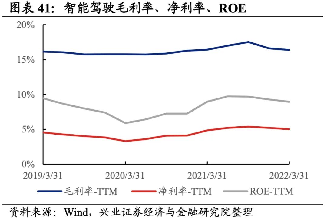 智能驾驶产业链营收增速继续回升但归母净利润增速回落,盈利能力小幅回落。从智能驾驶产业链整体来看,22Q1单季度归母净利润增速、营收增速分别是6.64%、10.99%,较21Q4单季度增速分别回落了18.7pct、回升了4.0pct。盈利能力小幅回落,毛利率、净利率、ROE下滑0.2pct、0.2pct、0.3pct。