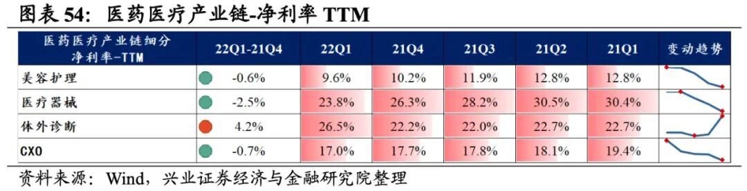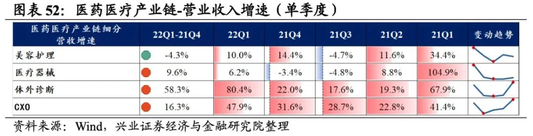 医药医疗产业链景气度出现分化,体外诊断业绩增速最高,其次是CXO,美容护理、医疗器械出现负增长。从增速趋势来看,除CXO外,其余细分产业链归母净利润增速均提升,体外诊断提升的幅度最大。盈利能力方面,仅有体外诊断毛利率或净利率较21Q4环比提升,其余环节盈利能力均有所回落,且医疗器械回落的幅度最大。具体来看:1)美容护理:归母净利润增速回升但仍处于负增长,盈利能力持续回落。22Q1归母净利润增速、营收增速分别是-19.5%、10.0%,增速较21Q4提升了17.9pct、回落了4.3pct,润增速回升但仍处于负增长,营收增速小幅回落。盈利能力持续回落,毛利率、净利率回落了0.4pct、0.6pct,均出现连续四个季度回落的情况。2)医疗器械:归母净利润增速回升但仍处于负增长,盈利能力持续回落。22Q1归母净利润增速、营收增速分别是-25.0%、6.2%,增速较21Q4提升了19.1pct、9.6pct,业绩增速边际改善,但归母净利润增速仍处于负增长。盈利能力持续回落,毛利率、净利率回落了1.5pct、2.5pct,均出现连续四个季度回落的情况。3)体外诊断:业绩增速大幅提升至较高水平,盈利能力改善。22Q1归母净利润增速、营收增速分别是160.7%、80.4%,增速较21Q4提升了114.5pct、58.3pct,业绩大幅提升至较高水平,主要受新冠检测的大幅增长。盈利能力改善,毛利率、净利率提升了2.0pct、4.2pct。4)CXO:业绩增速整体仍处于较高水平,但归母净利润增速边际回落。22Q1归母净利润增速、营收增速分别是31.3%、47.9%,增速较21Q4回落了7.4pct、提升了16.3pct,营收位于较高水平且持续提升,但归母净利润边际回落。往后看,医药医疗产业链中技术含量较高的细分领域对政策波动抵御力较强,仍有望维持高增长。前期在政策扰动等因素的影响下,医药医疗产业链回调时长和回调幅度整体超过了大部分其他新兴产业。站在当前时间点,需求端持续高景气、技术含量较高的CXO板块对政策波动抵御力较强,仍有望维持高增长。同时,复盘2020年,在疫情扰动下,CXO、医疗器械因其需求稳定,在疫情边际缓和后需求率先反弹,业绩回升到较快增长水平。建议重点关注CXO方向,同时优选医疗器械方向受政策影响较小、创新能力强的企业,以及体外诊断方向中受益于常态化核酸检测的企业。![]()