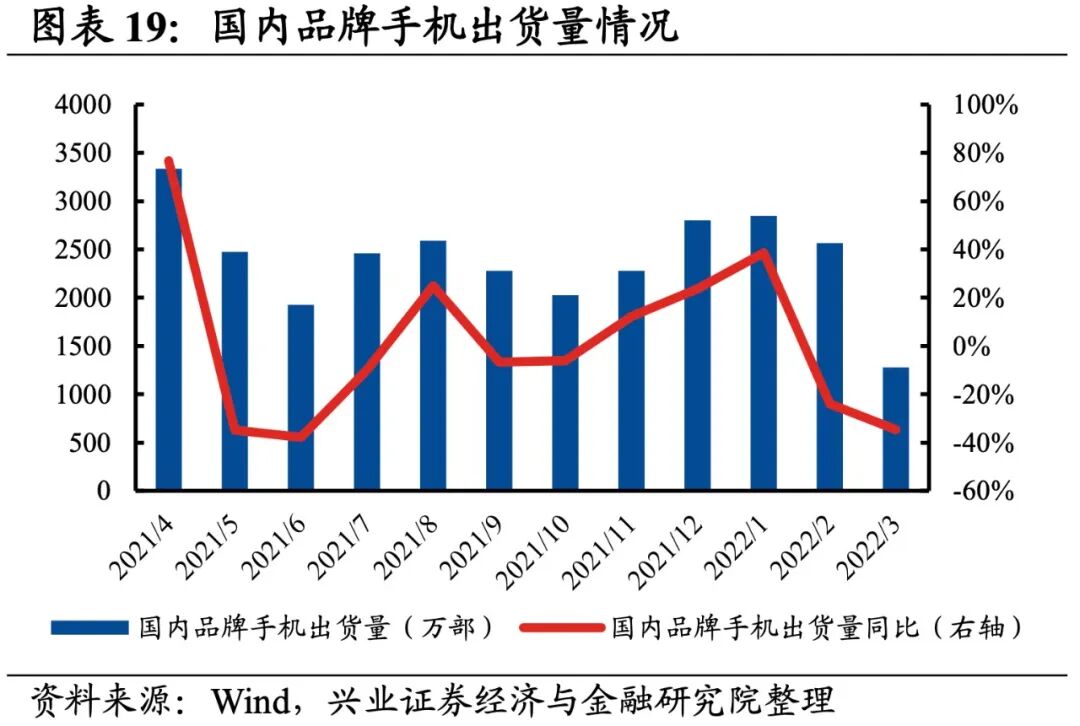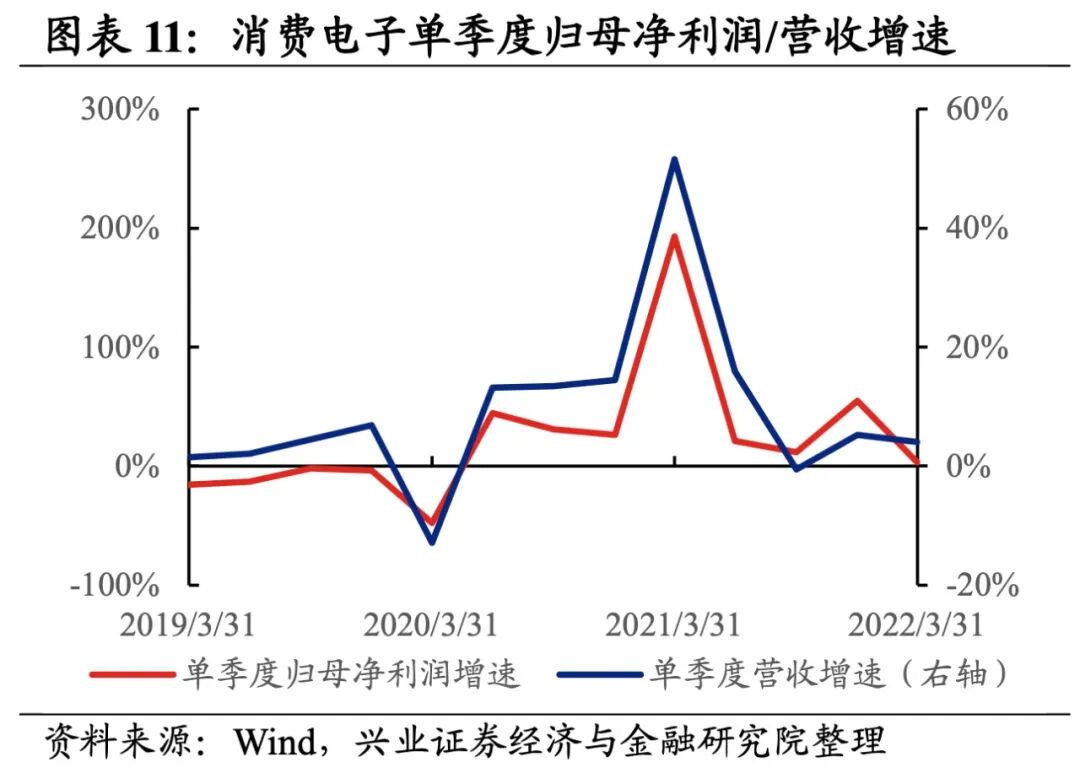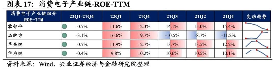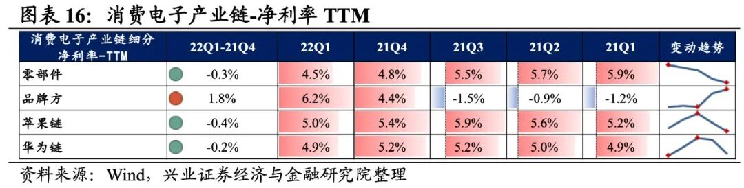 消费电子产业链环节景气度均处于较低水平,归母净利润均为负增长,其中零部件、品牌方缓解归母净利润均呈双位数下滑。从增速趋势来看,除零部件环节外,其余环节归母净利润增速均下滑,品牌方环节增速下滑的幅度最大。盈利能力方面,除品牌方环节毛利率或净利率有所提升,其余环节盈利能力均较21Q4有所下滑。具体来看:1)零部件:归母净利润仍处于负增长,盈利能力持续下滑。22Q1归母净利润增速、营收增速分别是-17.2%、20.3%,增速较21Q4提升了9.3 pct、8.6pct,业绩增速整体回升,但归母净利润增速连续第四个月负增长。毛利率、净利率下滑了0.4pct、0.3pct,均呈现出连续四个季度下滑的情况。2)品牌方:归母净利润增速大幅回落至负增长,但盈利能力持续提升。22Q1归母净利润增速、营收增速分别是-14.6%、-80.1%,增速较21Q4下滑了173.5pct、1.3pct,归母净利润增速大幅回落至负增长。不过盈利能力持续提升,毛利率、净利率提升了2.7pct、1.8 pct,均呈现出连续四个季度提升的情况。3)苹果链:归母净利润增速回落至负增长,盈利能力继续回落。22Q1归母净利润增速、营收增速分别是-5.5%、21.0%,增速较21Q4回落了1.5pct、提升了0.7pct,业绩有所增长但归母净利润增速回落。盈利能力继续回落,毛利率、净利率均下滑了0.4pct。4)华为链:归母净利润增速回落至负增长,盈利能力有所回落。22Q1归母净利润增速、营收增速分别是-1.5%、12.1%,增速较21Q4回落了32.2pct、1.9pct,归母净利润增速回落较多至负增长。盈利能力有所回落,毛利率、净利率均下滑了0.2pct。![]()