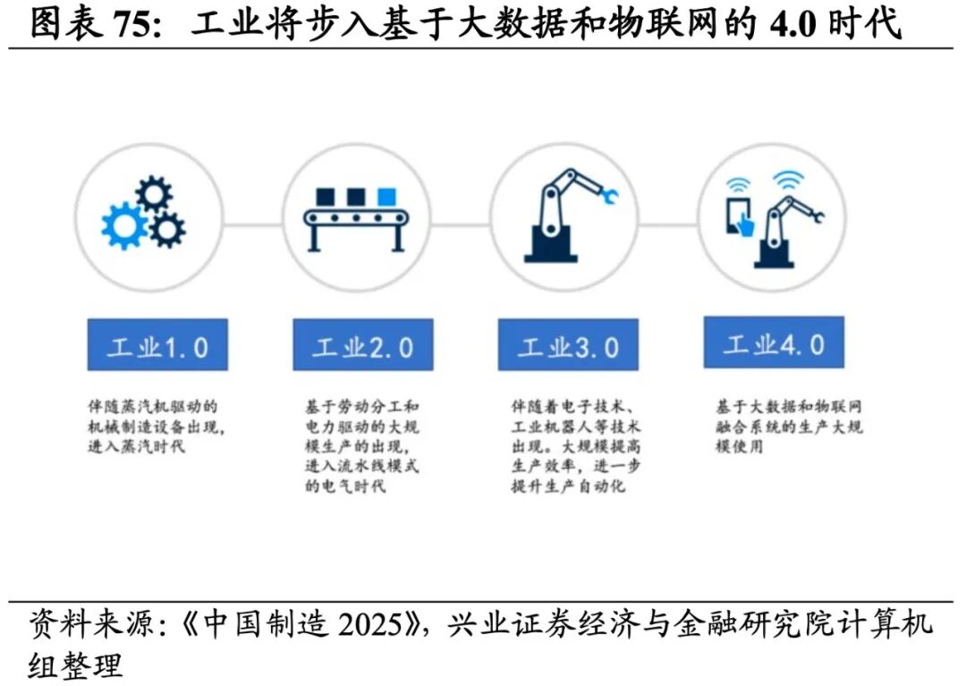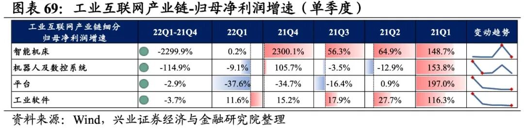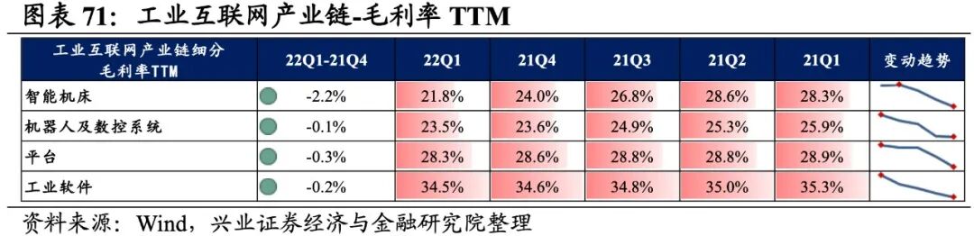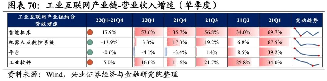 往后看,随着数字经济产业接连迎来政策红利以及北美云计算厂商Q1资本开支继续超预期,大数据和云计算赛道景气度有望迎来提升,不过短期业绩压力仍存。自今年1月《“十四五”数字经济发展规划》正式出台以来,数字经济产业接连迎来政策红利。今年2月,“东数西算”工程正式全面启动,数据中心相关的IDC、存储器领域迎来重大发展机遇。4月中央全面深化改革委员会第二十五次会议中,总书记也强调了数据安全、数字政府安全管理的重要性,网络安全行业盈利能力后续有望在相关政策加持下逐步改善。云计算方面,北美厂商Q1资本开支超预期彰显云计算高景气持续,国内BAT、三大运营商为首的云计算龙头企业资本开支也整体维持较高增速,在企业数字化转型的进程中业绩有望逐步放量。不过,当前国内大数据和云计算产业业绩放量或仍需时日,后续建议持续关注政策支持下云计算基础设施的建设情况、以及下游需求的后续释放情况。投资选择上优先关注受益于数据中心建设的IDC环节,以及全球云服务器需求激增催化下的存储器环节。工业互联网产业链涵盖智能机床、机器人及数控系统、平台、工业软件,共计4个细分行业。