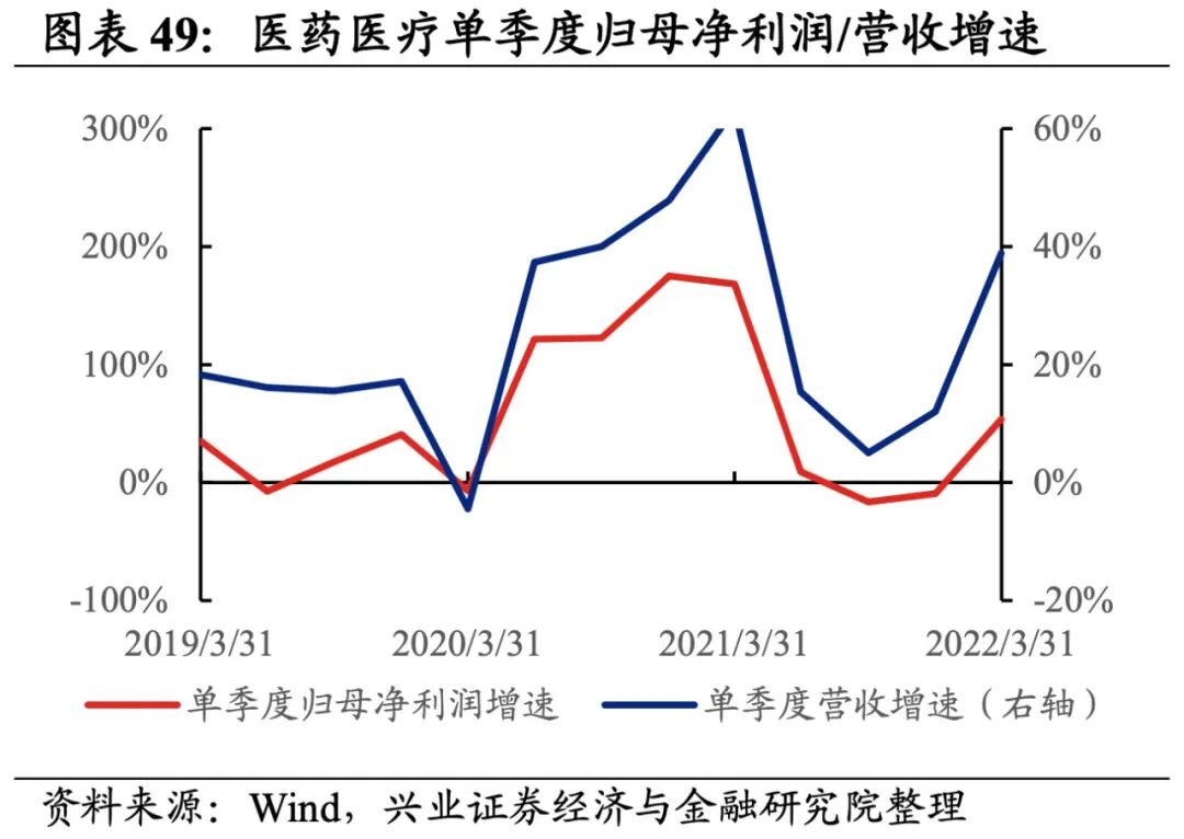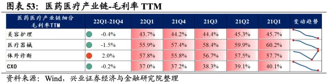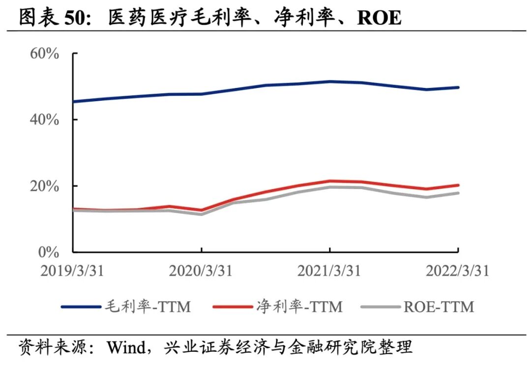 医药医疗产业链整体业绩大幅回升,盈利能力改善。从医药医疗产业链整体来看,22Q1单季度归母净利润增速、营收增速分别是53.41%、38.9%,较21Q4单季度增速分别回升62.8pct、26.8pct。盈利能力改善,毛利率、净利率、ROE提升0.6pct、1.1pct、1.3pct。