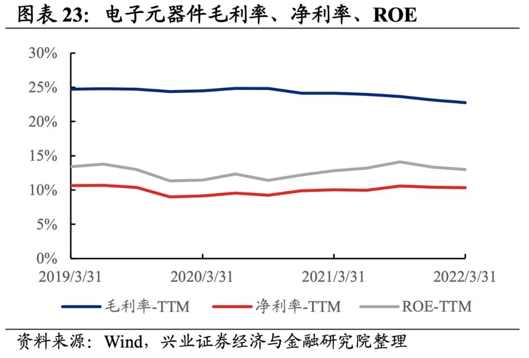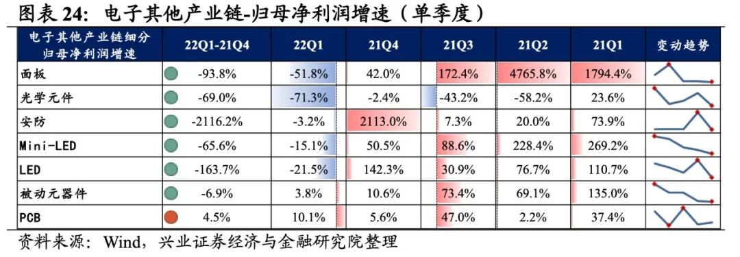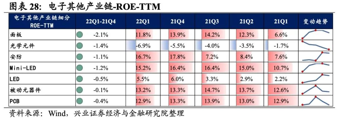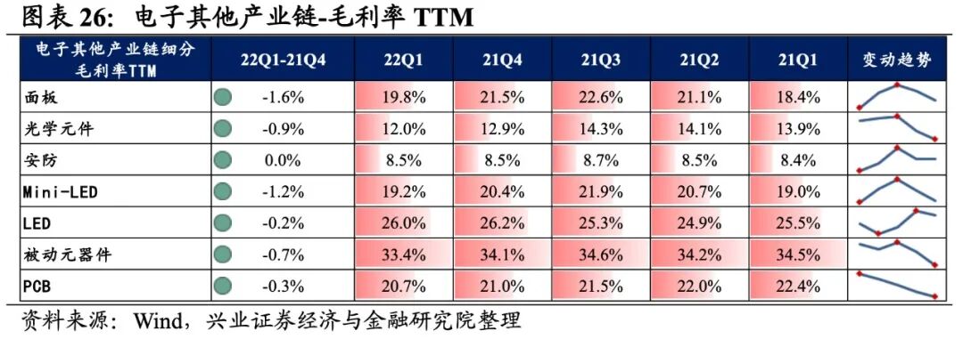 光学光电子产业链景气度回落较大,细分环节归母净利润均为负增长,安防归母净利润增速较高,其次是Mini-LED和LED。从增速趋势来看,所有环节归母净利润增速均下滑,安防增速下滑的幅度最大。盈利能力方面,所有环节毛利率或净利率均较21Q4下滑。具体来看:1)面板:归母净利润增速大幅转负,盈利能力有所回落。22Q1归母净利润增速、营收增速分别是-51.8%、7.1%,增速较21Q4回落了93.8pct、提升了10.3pct,营收增速转正但归母净利润增速大幅转负。盈利能力有所回落,毛利率、净利率下滑了1.6pct、1.3pct。2)光学元件:归母净利润加速下滑,盈利能力继续回落。22Q1归母净利润增速、营收增速分别是-71.3%、-23.1%,增速较21Q4回落了69.0pct、提升了1.8pct,归母净利润加速下滑。盈利能力继续回落,毛利率、净利率下滑了0.9pct、1.2pct,均出现连续两个季度回落的情况。3)安防:归母净利润增速大幅回落至负增长,营收持续下滑。22Q1归母净利润增速、营收增速分别是-3.2%、-38.3%,增速较21Q4回落了2116.2pct、提升了4.2pct。归母净利润大幅回落,增速由正转负,营收也连续四个季度大幅下滑。4)Mini-LED:业绩下行,盈利能力有所回落。22Q1归母净利润增速、营收增速分别是-15.1%、19.1%,增速较21Q4回落了65.6pct、28.2pct,业绩表现较差,归母净利润增速连续四季度下行。盈利能力有所回落,毛利率、净利率下滑了1.2pct、0.8pct。5)LED:归母净利润增速大幅回落至负增长,盈利能力有所回落。22Q1归母净利润增速、营收增速分别是-21.5%、4.5%,增速较21Q4回落了163.7pct、7.3pct,归母净利润增速大幅回落至负增长。盈利能力有所回落,毛利率、净利率下滑了0.2pct、0.5pct。电子元器件产业链业绩增速基本持平,盈利能力有所回落。从电子元器件产业链整体来看,22Q1单季度归母净利润增速、营收增速分别是7.94%、11.38%,较21Q4单季度增速分别提升1.1pct、下滑0.6pct。盈利能力有所回落,毛利率、净利率、ROE下降0.4pct、0.1pct、0.3pct。![]()