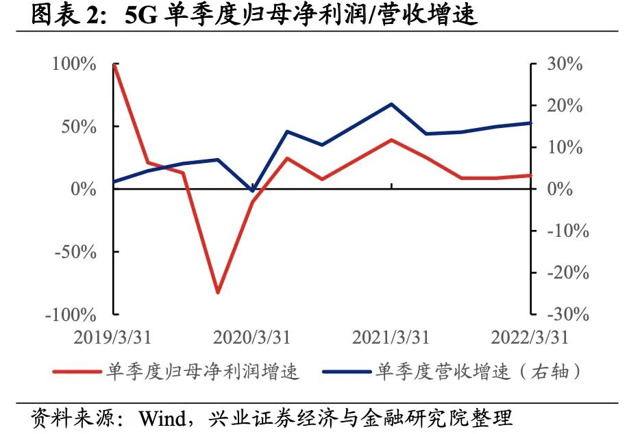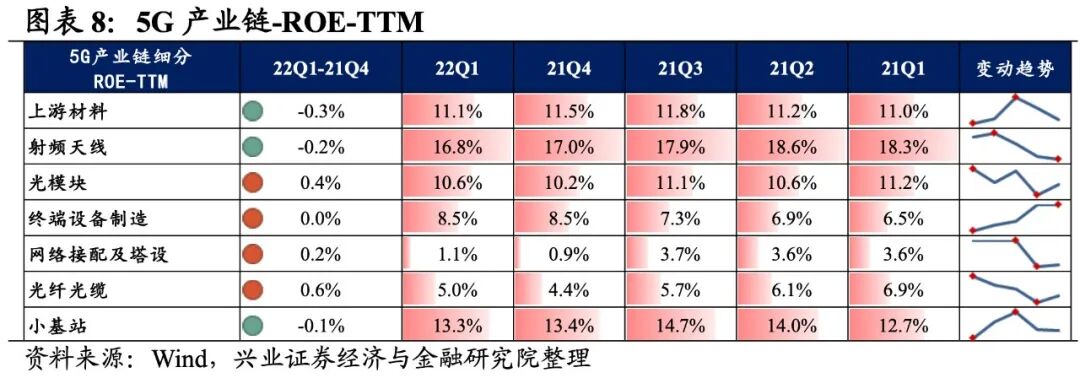 5G产业链环节景气出现分化,光纤光缆净归母净利润增速较高,其次是光模块、网络接配及塔设环节。从增速趋势来看,终端设备制造、网络服务和运营商环节归母净利润增速下滑,其他环节归母净利润增速均较21Q4提升,其中网络接配及塔设归母净利润增速提升的幅度最大。盈利能力方面,网络接配及塔设、光纤光缆、小基站、网络服务环节毛利率、净利率均较21Q4有所提升,而其余环节盈利能力下滑,且射频天线环节盈利能力下滑幅度最大。具体来看:1)上游材料:业绩小幅增长且边际改善,盈利能力小幅回落。22Q1归母净利润增速、营收增速分别是5.9%、12.7%,增速较21Q4提升了2.8pct、0.7pct。毛利率、净利率回落了0.3pct、0.1pct,毛利率连续四个季度下滑。2)射频天线:归母净利润增速边际改善,盈利能力持续回落。22Q1归母净利润增速、营收增速分别是15.5%、52.0%,增速较21Q4回升了20.8pct、回落了27.0pct。盈利能力持续回落,毛利率、净利率回落了0.8pct、0.3pct,均连续四个季度下滑。3)光模块:业绩增速较高且边际改善明显,盈利能力小幅回落。22Q1归母净利润增速、营收增速分别是39.2%、35.4%,增速较21Q4回升了33.6pct、2.2pct,景气度边际提升。盈利能力小幅回落,毛利率回落了0.2pct,净利率持平,毛利率连续四个季度下滑。4)终端设备制造:业绩与盈利能力均有所回落。22Q1归母净利润增速、营收增速分别是12.1%、25.9%,增速较21Q4回落了1061.7pct、19.6pct,其中归母净利润增速回落较多,主要是由于永鼎股份、东土科技两只个股回落较大。盈利能力也小幅回落,毛利率、净利率回落了0.1pct、0.2pct。5)网络接配及塔设:归母净利润增速大幅转正,归母净利润增速由负转正。22Q1归母净利润增速、营收增速分别是33.9%、18.7%,增速较21Q4提升了1125.9pct、回落了2.4pct,归母净利润增速大幅转正。盈利能力小幅回升,毛利率、净利率均回升了0.2%。6)光纤光缆:归母净利润增速大幅转正,盈利能力有所提升。22Q1归母净利润增速、营收增速分别是46.1%、10.3%,增速较21Q4提升了170.3pct、0.7pct,归母净利润增速由负转正且大幅提升。盈利能力有所提升,毛利率、净利率提升了0.7pct、0.4pct。7)小基站:归母净利润增速由负转正,毛利率持续提升。22Q1归母净利润增速、营收增速分别是9.5%、10.8%,增速较21Q4提升了38.1pct、回落了0.7pct,归母净利润增速转正但业绩增速回落。盈利能力方面,毛利率较21Q4环比提升0.6pct,出现连续四个季度提升的情况,净利率持平。8)运营商:归母净利润增速有所回落,营收增速有所回升。22Q1归母净利润增速、营收增速分别是8.6%、12.3%,增速较21Q4回落了6.9pct、提升了7.1pct,归母净利润增速有所回落,营收增速有所回升。9)网络优化设计:业绩增速整体提升,盈利能力小幅回落。22Q1归母净利润增速、营收增速分别是10.3%、12.9%,增速较21Q4提升了3.4pct、7.7pct。盈利能力小幅回落,毛利率、净利率下滑了0.3pct、0.1pct。10)网络服务:业绩增速回落较多,但盈利能力持续提升。22Q1归母净利润增速、营收增速分别是12.4%、0.4%,增速较21Q4回落了696.5pct、45.1pct,整体回落较多。但盈利能力持续提升,毛利率、净利率提升了0.6pct、0.1pct,均连续四个季度提升。