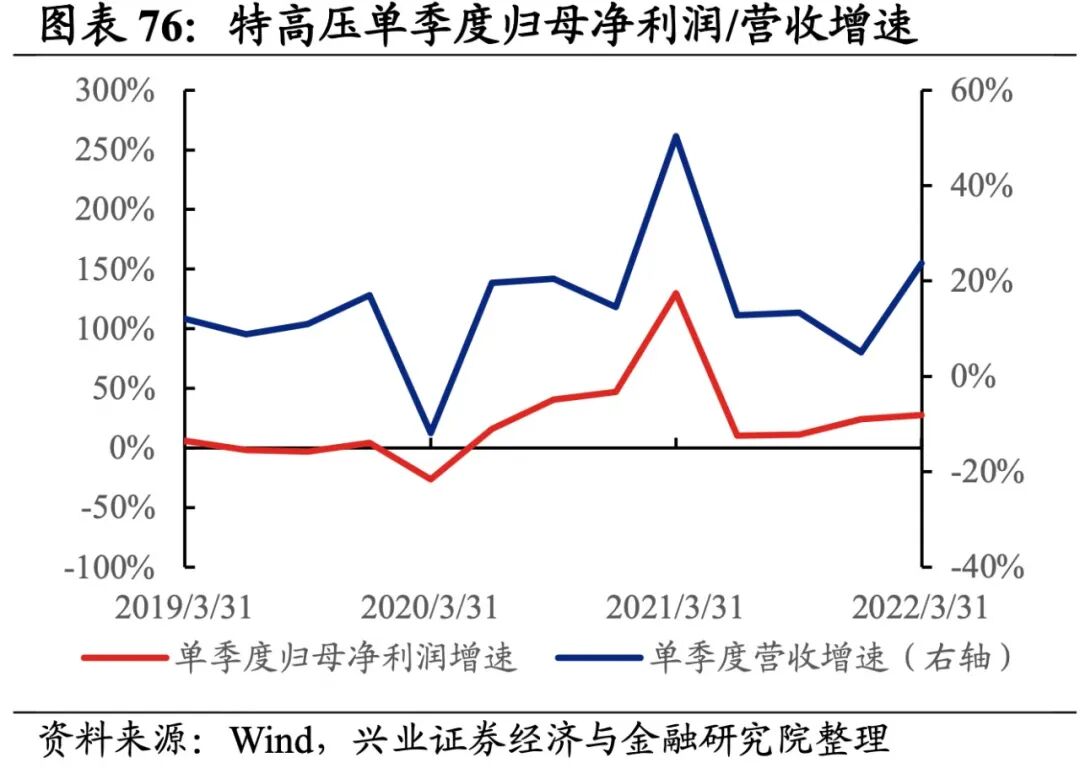 特高压产业链整体业绩触底回升,盈利能力改善。从特高压产业链整体来看,22Q1单季度归母净利润增速、营收增速分别是27.38%、23.7%,较21Q4单季度增速分别回升3.1pct、18.6pct。盈利能力改善,毛利率、净利率持平,ROE提升0.5pct。