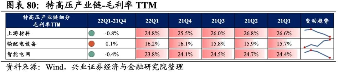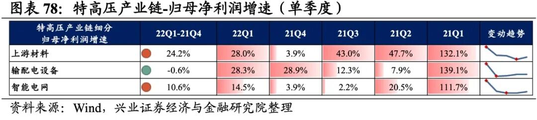 特高压产业链景气度整体加速提升,输配电设备、上游材料归母净利润增速较高,其次是智能电网。从增速趋势来看,除输配电设备外,其余环节归母净利润增速均上行,上游材料增速回升的幅度最大。盈利能力方面,除输配电设备外,其余环节盈利能力均较21Q4有所回落。具体来看:1)上游材料:归母净利润增速大幅提升,盈利能力有所回落。22Q1归母净利润增速、营收增速分别是28.0%、25.6%,增速较21Q4提升了24.2pct、3.6pct,业绩增速处于较高水平,归母净利润增速大幅提升。盈利能力边际回落,毛利率回落了0.8pct,净利率持平,毛利率连续四个季度回落。2)输配电设备:营收增速提升较多,盈利能力连续回升。营收增速分别是28.3%、23.5%,增速较21Q4回落了0.6pct、提升了20.1pct,景气度处于较高水平,营收增速提升较多。盈利能力连续回升,毛利率、净利率均提高了0.1pct,均连续两个季度提升。3)智能电网:业绩增速继续提升,盈利能力持续回落。22Q1归母净利润增速、营收增速分别是14.5%、22.1%,增速较21Q4提升了10.6pct、6.1pct,业绩增速继续提升。盈利能力持续回落,毛利率、净利率回落了0.4pct、0.2pct,均出现连续四个季度下行的情况。