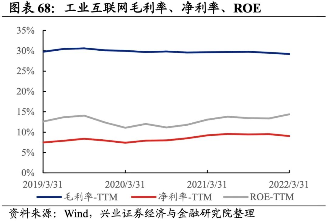 工业互联网产业链整体业绩增速下滑,其中归母净利润增速转负,毛利率、净利率均有所回落。从工业互联网产业链整体来看,22Q1单季度归母净利润增速、营收增速分别是-21.17%、2.97%,较21Q4单季度增速分别下滑42.4pct、5.0pct。盈利能力回落,毛利率、净利率下滑0.3pct、0.5pct,ROE回升1.0pct。