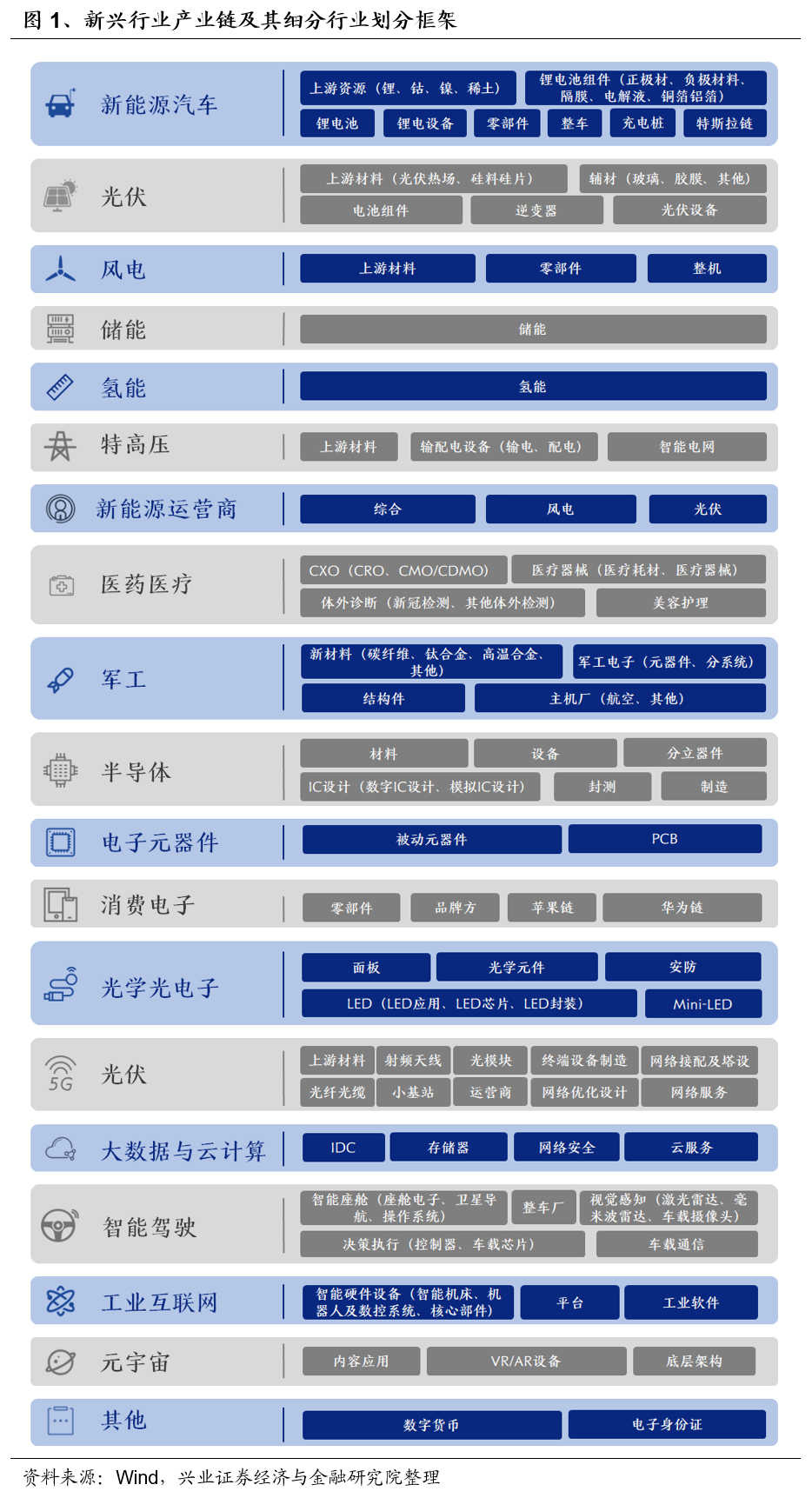 前言:近些年随着经济高质量发展的推进,新兴行业在A股的权重大幅增加,且单个新兴产业链可能横跨多个一级或二级行业,其上中下游产业链的景气变动往往具有较强的联动性,但目前常用的行业分类中对新兴行业的划分较为粗糙、也难以更好地表征产业链之间的关系。因此,我们将新兴行业划分为十二大产业链、共86个细分行业,以更加精准捕捉新兴产业链各细分环节的景气变动。5月14日《“新半军”40个细分行业景气与展望》中详细梳理了“新半军”六大产业链、40个细分行业景气与后续展望,本报告继续梳理新兴行业中5G、消费电子、其他电子、元宇宙、智能驾驶、医药医疗、大数据与云计算、工业互联网、特高压共九大产业链、46个细分行业的景气与后续展望,供投资者参考。![]()