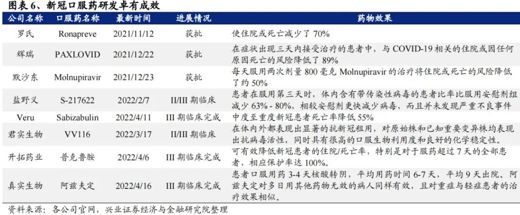 新冠口服药研发捷报频传。海外方面,2021年11月以来,默沙东研发的Molnupiravir、辉瑞研发的PAXLOVID和罗氏研发的Ronapreve各自在美国、中国、日本等多个国家获得使用许可;2022年2月7日,盐野义公司公布S-217622最新III期临床试验数据,患者在服用第三天时,体内含有带传染性病毒的患者比率比服用安慰剂组减少63%-80%。国内方面,开拓药业研发的普克鲁胺、君实生物研发的VV116、真实生物研发的阿兹夫定等分别在2022年4月6日、3月17日、4月16日公布III期临床试验,获得了新的突破性进展。从现有口服药来看,口服特效药具备价格较低、运输便利等优势,抗药性及最终药效成果喜人,伴随口服药研发进入收获期,新冠疫情威胁有望得到进一步遏制。