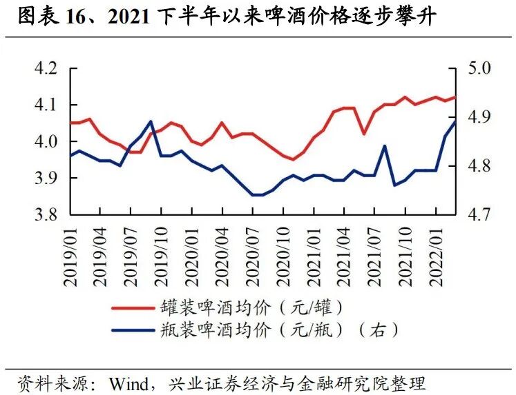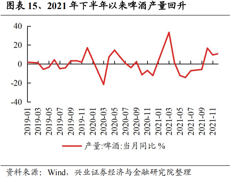 另外啤酒方面,也因为消费场景的增加带动量价齐升。啤酒作为线下聚会、KTV等常见大众酒类,有着价格低廉、需求量大且购买途径便捷的特点。在疫情改善后,消费场景增加,啤酒的产需都获得大幅提升,2021年12月啤酒产量当月同比增加10.90%,2022年3月,36大中城市罐装和瓶装啤酒均价相比疫情期间最低值提高了4.30%和3.16%。