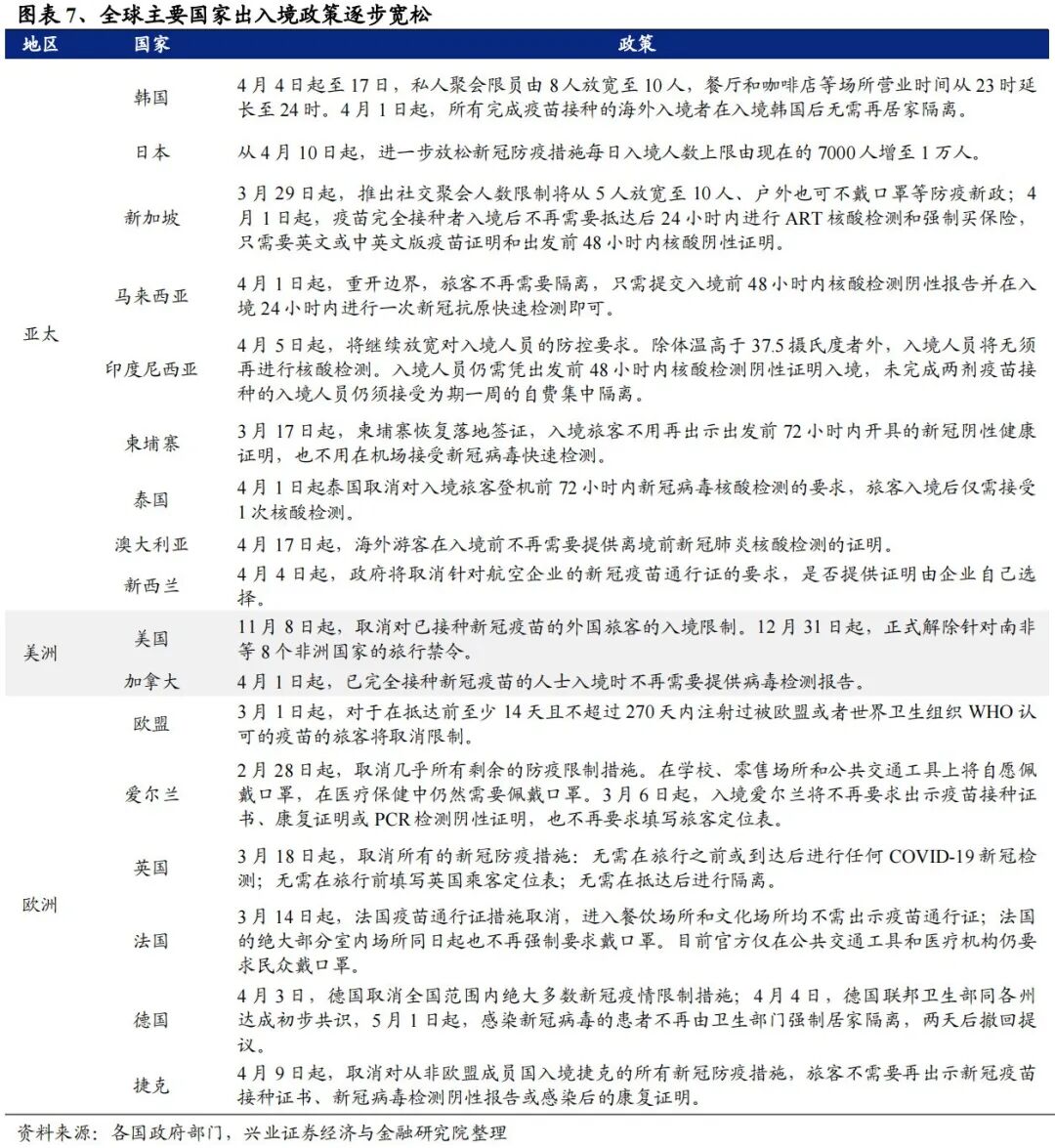 Omicron引发新一轮全球疫情“海啸”,随着主要国家新增确诊人数回落,绝大部分国家出入境政策逐步放宽。2021年11月Omicron新毒株出现后,各国确诊人数飙升,各国入境防疫政策普遍出现收紧。值得注意的是,本轮变异毒株虽然将全球确诊人数推向新高,但各国感染死亡率却并不高。目前,全球主要国家新增病例数已见顶回落,部分国家开始继续推进出入境政策的放宽。2022年3月1日,欧盟对抵达前至少14天且不超过270天内注射过被欧盟或者世界卫生组织WHO认可的疫苗的旅客取消旅行限制,但德国仍受疫情较大影响,防疫政策有所反复;北美防疫政策自2021年11月8日起已经逐步放开,本轮Omicron引起的新冠疫情对政策影响不大;亚太地区4月最新出入境政策整体处于逐步放松态势,已完成新冠疫苗接种的旅客入境基本仅需一次核酸检测,社交限制也逐步放开;国内出入境政策仍维持在较为严格的水准。整体而言,目前疫情防控常态化已成各国共识,在内部与全球疫情控制在合理范围内逐步放开趋势逐步明朗,全球流动与协作渐次恢复。