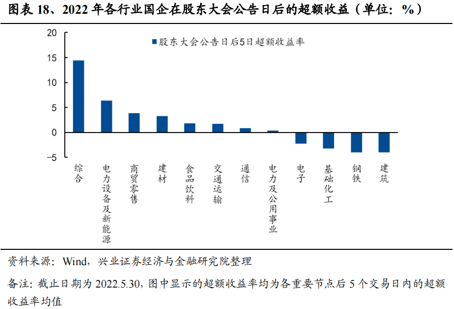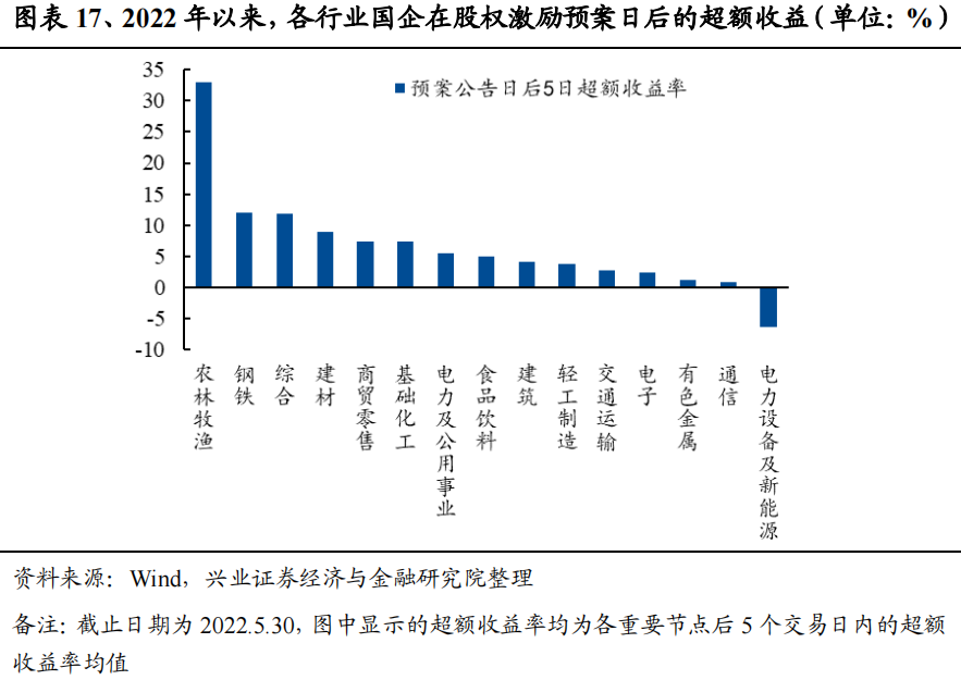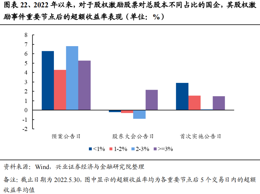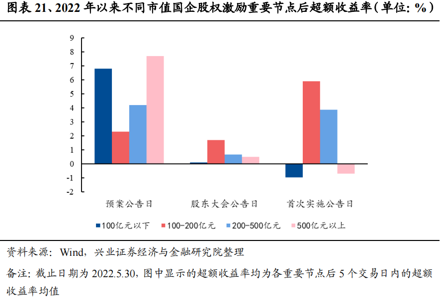 综合来看,国企股权激励的短期投资最佳时间点为股权激励预案日后。股权激励的重要时间节点包括股权激励预案日、股东大会公告日和首次实施公告日等。以万得全A为基准,测算2022年以来国企股权激励事件发生后5个交易日内的超额收益均值(截止日期为2022年5月30日):按时点细分,股权激励预案日/股东大会公告日/首次实施公告日后5个交易日内,超额收益率分别为5.65%/0.46%/1.40%,均跑赢万得全A,且在股权激励预案日后的5个交易日内,超额收益率达到最高。