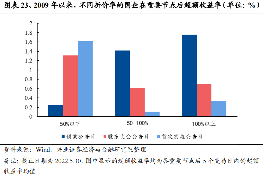 不同折价率也能够反映不同的股权激励力度,股权激励方案中折价率偏低的企业,在股东大会公告日和首次实施公告日之后的超额收益率更高。折价率越低,说明员工能够以越低的成本获取股票,体现了越强的股权激励力度。将各国企按照折价率(授予价格/股权激励预案前一日价格)分为三个组别,分别是50%以下、50-100%和100%以上[1]。自2009年以来,股权激励预案日、股东大会公告日和首次实施公告日后5个交易日内,超额收益率最高的组别分别为100%以上(1.77%)、50%以下(1.31%)和50%以下(1.61%)。从2009年以来的整体统计样本来看,偏低的折价率往往代表着较大的激励力度,故而普遍能够引起市场较为积极的反应。
