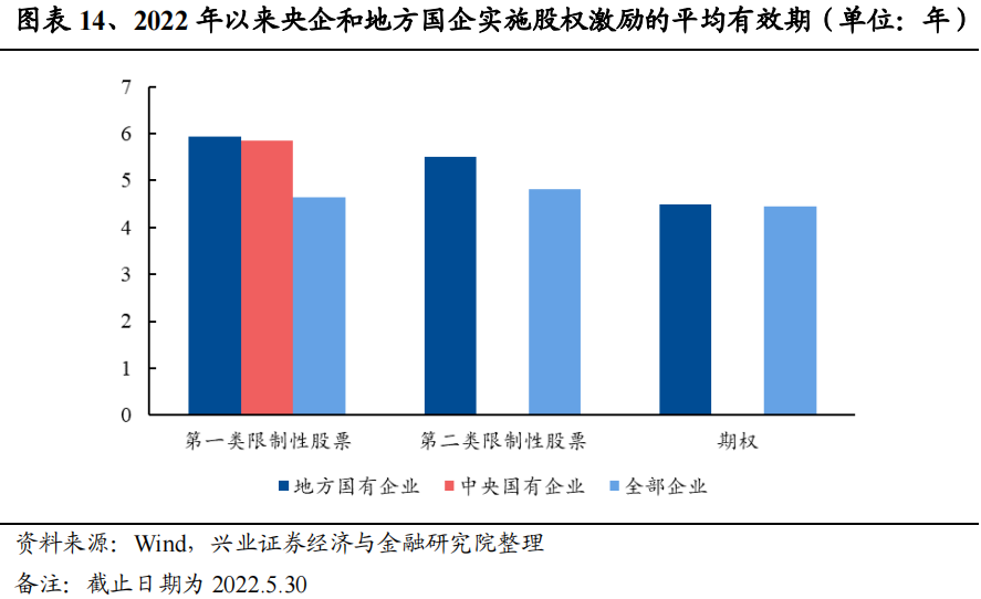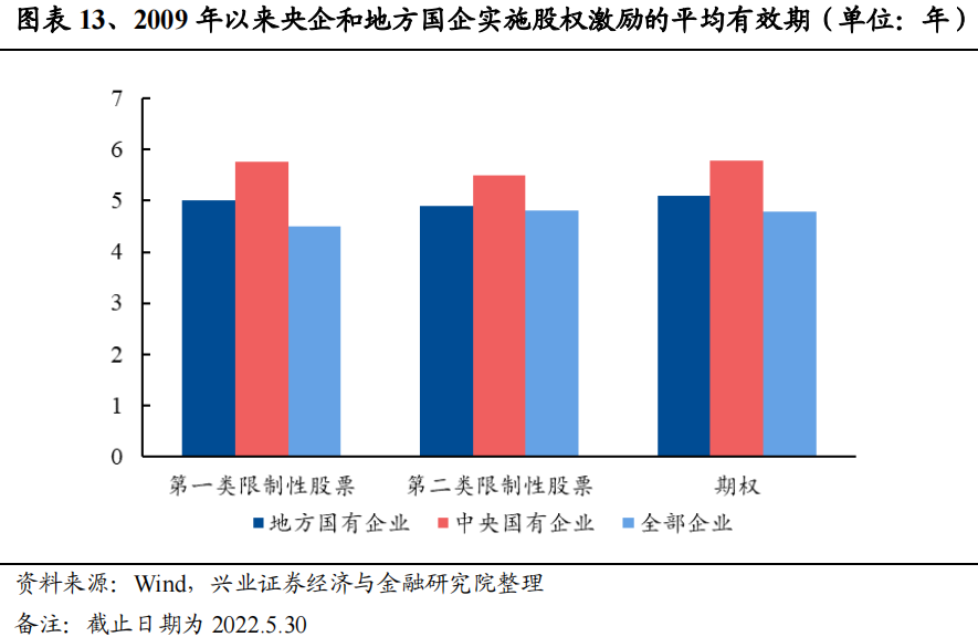 央企股权激励有效期长于地方国企。按照激励标的物对股权激励事件进行分类,可知2009年以来的股权激励事件中,地方国企采用第一类限制性股票/第二类限制性股票/期权的有效期均值分别为5.01/4.89/5.10年,而央企对应组别的有效期均值分别为5.76/5.50/5.79年,全体企业对应的有效期则为4.51/4.81/4.71年,可以发现,央企股权激励的有效期长于地方国企。