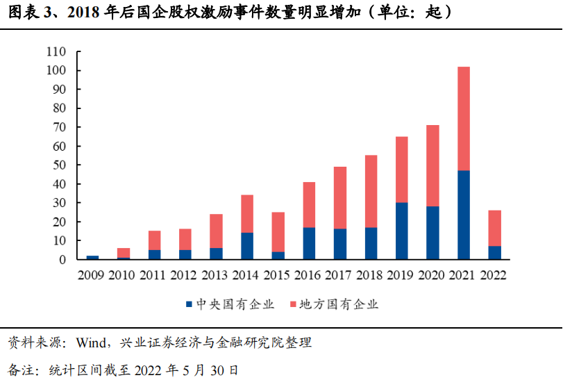 2022年,市场对国企股权激励事件的关注度或将持续升温。梳理历年股权激励数量可知,2018年,A股共发生了55起国企股权激励事件,2019-2021年分别为65、71、102起。不难看出,受2019-2020年间密集政策落地推动,2018年后国企股权激励事件数量明显增加。2022年以来,截至5月30日,共有26起股权激励事件发生。受益于股权激励机制的日益完善和国企改革三年行动计划收官之年的来临,市场对国企股权激励事件的关注度或将持续升温。