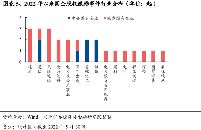 小市值板块的国企股权激励事件发生更为频繁。将发生股权激励的国企按照总市值划分为100亿元以下、100-200亿元、200-500亿元和500亿元以上四个组别。2022年以来,截至5月30日,分别发生了14/3/7/2起股权激励事件。对于央企,在市值200-500亿元的分组中出现了3起股权激励事件,为各组中最多;对于地方国企,在市值100亿元以下的分组中出现了12起股权激励事件,远远领先于其他市值分组。总体来看,市值较小的地方国有企业会更频繁地发起股权激励。