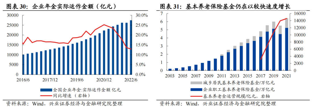 年金2022年第四季度增量预计197亿元。截至2022Q2,全国企业年金实际运作金额已达2.73万亿元,同比增速12.9%。若保持12.9%增速,2022年底有望达到2.94万亿元。近几年企业年金股票投资占比在7%左右,假设2022年维持不变,2022年增量预计236亿元,第四季度增量预计达到59亿元。截至2021年底,全国职业年金基金投资运营规模超过1.79万亿元,较2020年增加7900亿元,预计后续每年增加7900亿,参考年金股票投资比例约7%,2022全年增量为553亿元,第四季度增量预计138亿元。加总来看,年金2022年第四季度增量预计197亿元。3、养老金:第四季度增量预计43亿元