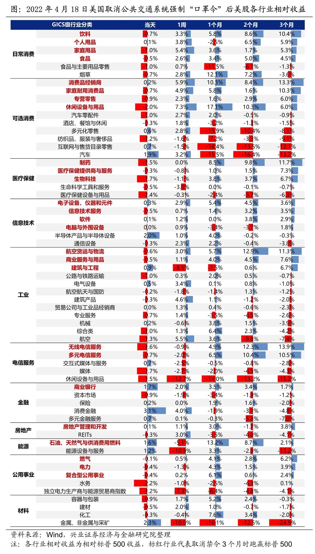 2022年4月18日,美国取消公共交通系统强制“口罩令”,疫情管控逐渐放松。在禁令取消3个月后美股62个GICS细分行业中有27个跑赢标普500,集中分布在日常消费、可选消费、医疗保健和信息技术行业,其中无线电信服务(+13.9%)、消费品经销商(+13.3%)、制药(+11.7%)、航空货运与物流(+11.3%)与饮料(+10.4%)相对收益较优。